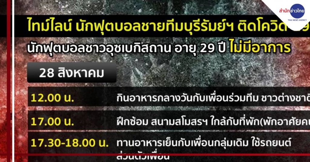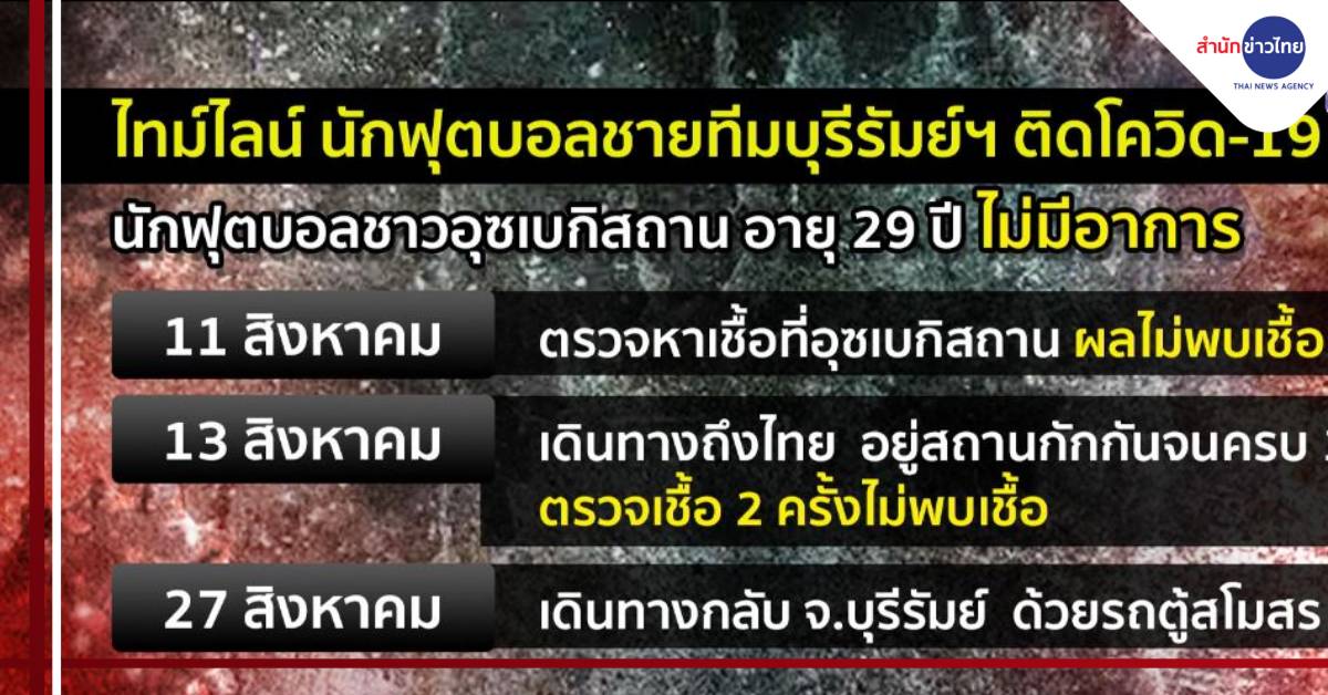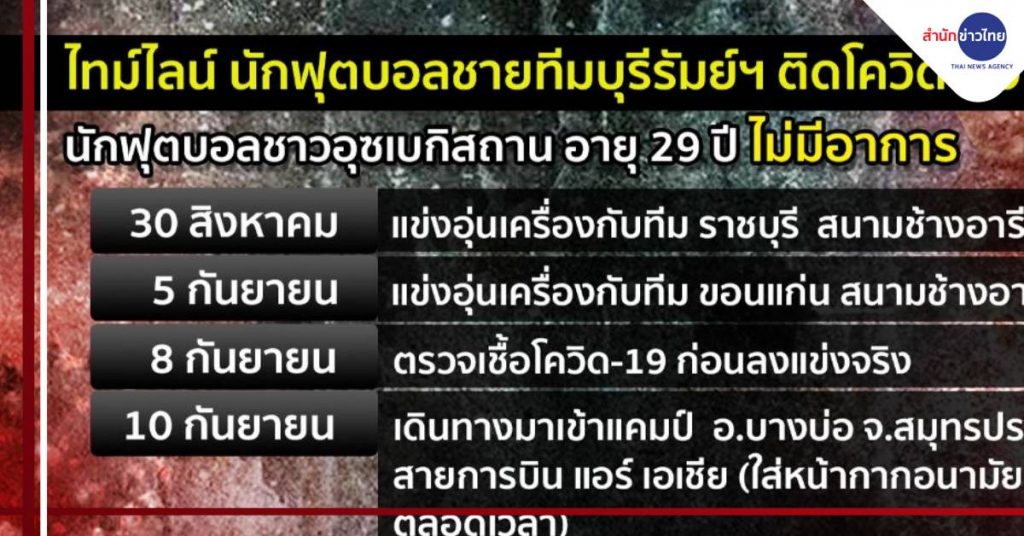 ก.สาธารณสุข 11 ก.ย. – เปิดไทม์ไลน์นักฟุตบอลไทยลีกชาวอุซเบกิสถานติดเชื้อ “โควิด-19” หลังเข้าตรวจคัดกรองก่อนลงสนาม ทำให้ต้องเลื่อนการแข่งขันของ 3 ทีม ซึ่งมีประวัติอุ่นเครื่องร่วมกัน