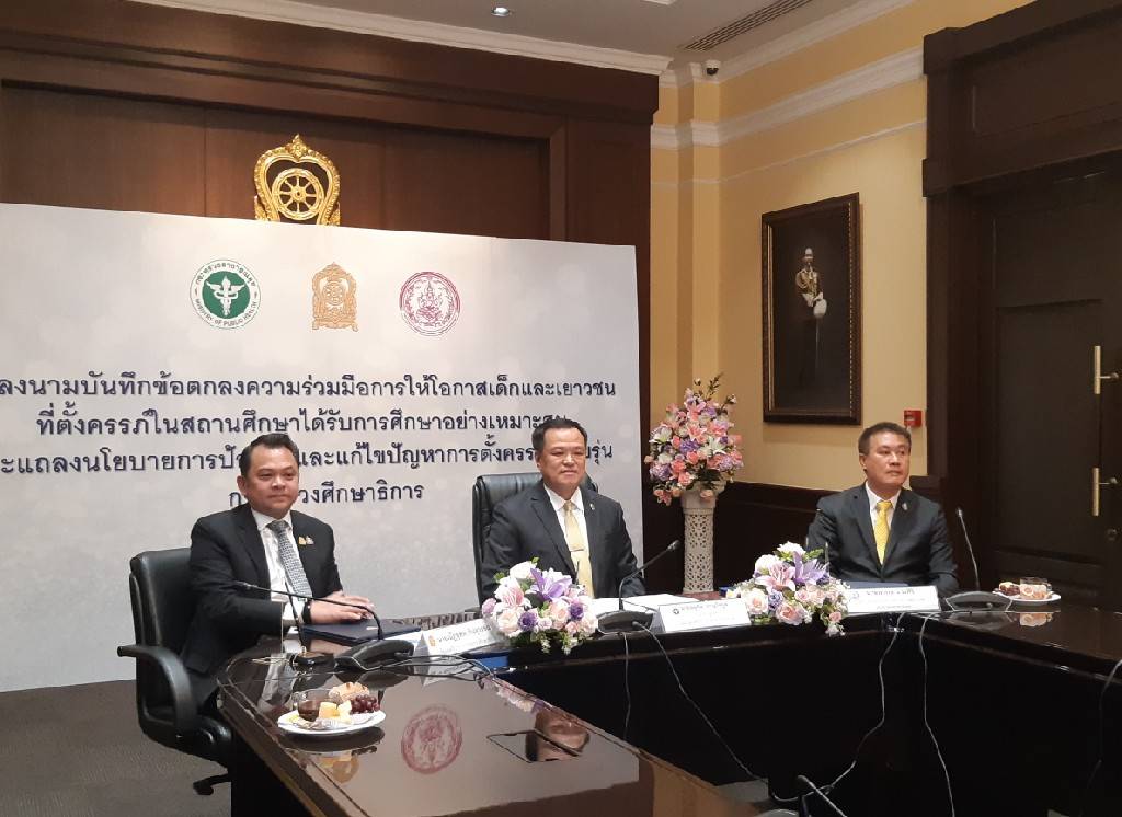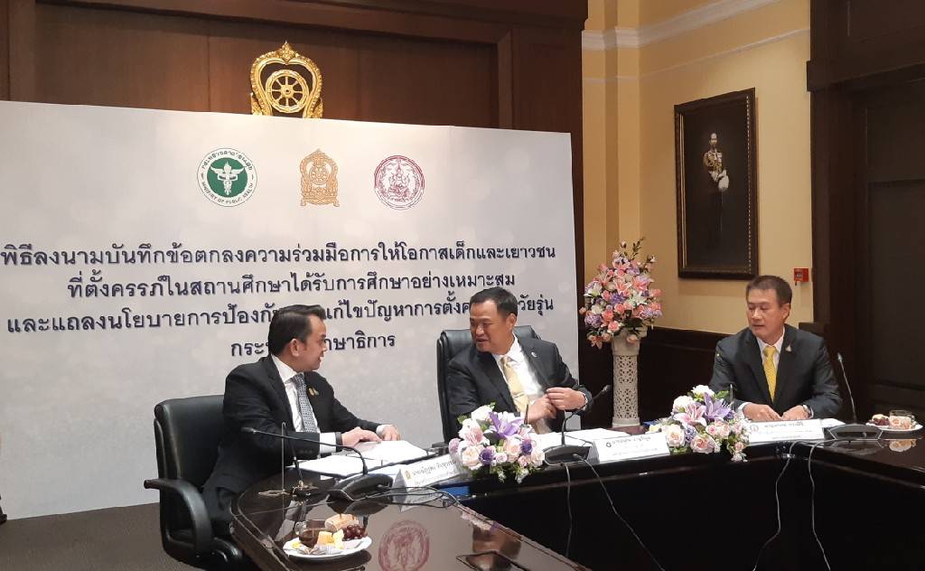 ศธ.14ก.ย.- 3 กระทรวงหลัก สาธารณสุข ศึกษา และพม. ร่วมลงนาม ป้องกันและแก้ปัญหาตั้งครรภ์ในวัยรุ่นและให้โอกาสได้ศึกษาในระบบอย่างเหมาะสม หลังพบเด็กหลุดออกจากระบบการศึกษาจำนวนมาก เมื่อตั้งครรภ์ในวัยเรียน ส่งผลต่อคุณภาพชีวิตการประกอบอาชีพในอนาคต