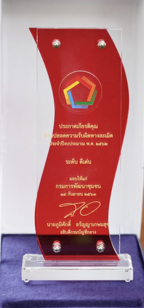 รางวัลแรก เป็นรางวัลประกาศเกียรติคุณด้านปลอดความรับผิดทางละเมิด ระดับดีเด่น กรมการพัฒนาชุมชนตระหนักถึงความสำคัญในการส่งเสริมและพัฒนาให้เจ้าหน้าที่พัฒนาชุมชนทุกคน ปฏิบัติหน้าที่ด้วยความถูกต้องโปร่งใส มีประสิทธิภาพ คุ้มค่าต่อเงินงบประมาณ ใส่ใจความทุกข์ร้อนและบำรุงสุขของประชาชนอย่างสม่ำเสมอ โดยตลอดระยะเวลาที่ผ่านมากรมฯ ได้กำหนดมาตรการป้องกันไม่ให้เจ้าหน้าที่กระทำการอันเป็นการละเมิดแก่ประชาชน ทั้งในระดับหน่วยงานด้วยโครงการพัฒนาชุมชนใสสะอาด เพื่อส่งเสริมการบริหารจัดการองค์กรตามหลักความโปร่งใสสามารถตรวจสอบได้ และระดับบุคคลด้วยการพัฒนาองค์ความรู้ในการปฏิบัติหน้าที่พัฒนาชุมชน การเงิน การคลัง การพัสดุ ความรู้เกี่ยวกับความรับผิดทางละเมิด และวิธีปฏิบัติราชการทางปกครองแก่บุคลากรทุกคนอย่างต่อเนื่องเป็นประจำทุกปีตั้งแต่ปี พ.ศ. 2552 รวมถึงส่งเสริมให้ภาคประชาชนเข้ามามีส่วนร่วมในการสร้างความโปร่งใสและป้องกันการทุจริตประพฤติมิชอบ โดยการได้รับรางวัลองค์กรที่มีความเป็นเลิศในการบริหารจัดการด้านการเงินการคลัง ประจำปีงบประมาณ พ.ศ. 2562 ด้านปลอดความรับผิดทางละเมิด ระดับดีเด่น ในครั้งนี้ เป็นเกียรติประวัติและความภาคภูมิใจอย่างยิ่งของกรมการพัฒนาชุมชน สะท้อนให้เห็นถึงความสามารถ ศักยภาพ และความตั้งมั่นของเจ้าหน้าที่พัฒนาชุมชนทุกคนในการปฏิบัติหน้าที่อย่างถูกต้องตามระเบียบกฎหมายและแบบแผนของทางราชการ