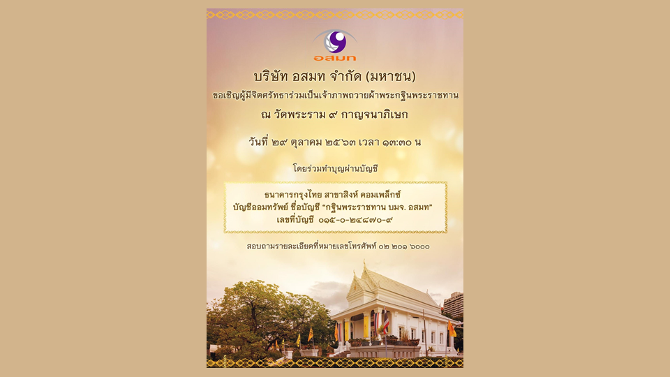บริษัท อสมท จำกัด (มหาชน) ขอเชิญผู้มีจิตศรัทธาร่วมเป็นเจ้าภาพถวายผ้าพระกฐินพระราชทาน ณ วัดพระราม 9 กาญจนาภิเษก ในวันที่ 29 ตุลาคม 2563 เวลา 13.30 น โดยร่วมทำบุญผ่านบัญชีธนาคารกรุงไทย สาขาสิงห์ คอมเพล็กซ์ บัญชีออมทรัพย์ ชื่อบัญชี “กฐินพระราชทาน บมจ. อสมท” เลขที่บัญชี 015-0-24870-9 .-สำนักข่าวไทย