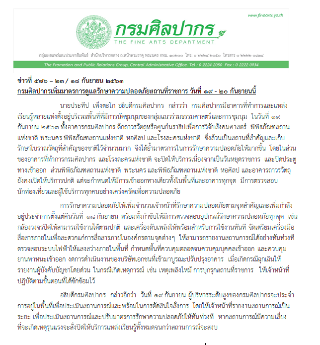 กรมศิลปากร 18 ก.ย.-กรมศิลปากรเพิ่มมาตรการดูแลรักษาความปลอดภัยสถานที่ราชการ วันที่ 19-20 กันยายนนี้