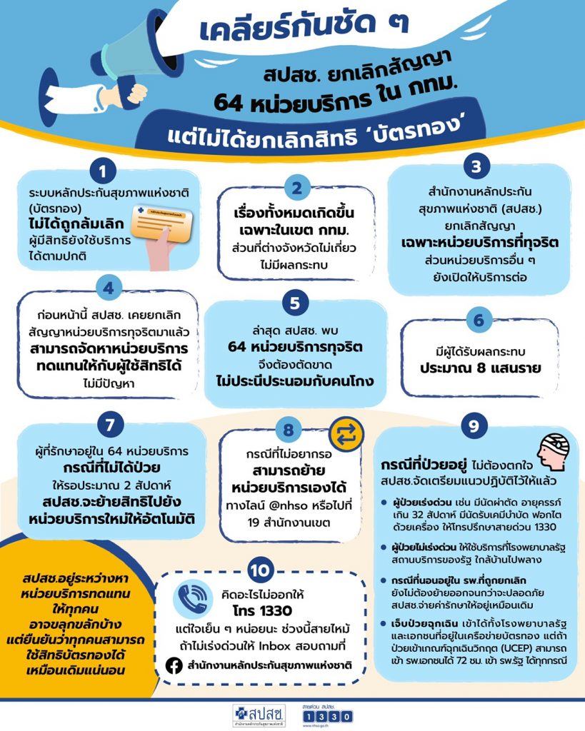 ตรวจสอบรายชื่อ 64 คลินิกและ รพ.ที่ถูกยกเลิกสัญญาได้ที่ https://bkk.nhso.go.th/main/shownews.php?newsid=4664