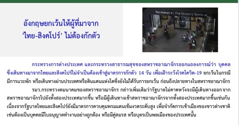 กระทรวงการต่างประเทศ และกระทรวงสาธารณสุขของสหราชอาณาจักรออกแถลงการณ์ว่า บุคคล ซึ่งเดินทางมาจากไทยและสิงคโปร์ไม่จำเป็นต้องเข้าสู่มาตรการกักตัว 14 วัน เพื่อเฝ้าระวังโรคโควิด-19 ยกเว้นในกรณี มีการแวะพัก หรือเดินทางผ่านประเทศหรือดินแดนแห่งใดซึ่งยังไม่ได้รับการยกเว้น ก่อนถึงปลายทางในสหราชอาณาจักร