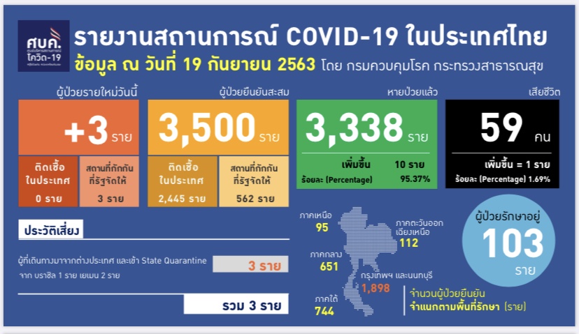 กรุงเทพฯ19 ก.ย..-วันนี้ ไทยมีผู้ป่วยโควิด-19 รายใหม่3 ราย ทำให้มีผู้ป่วยยืนยันสะสม 3,500 ราย เสียชีวิต 59 คน หายป่วย 3,338 คน รักษาอยู่ 103 คน ประเทศไทยอยู่ในลำดับที่ 131 ด้านอังกฤษยกเว้นให้ผู้ที่มาจาก ‘ไทย-สิงคโปร์’ ไม่ต้องกักตัว