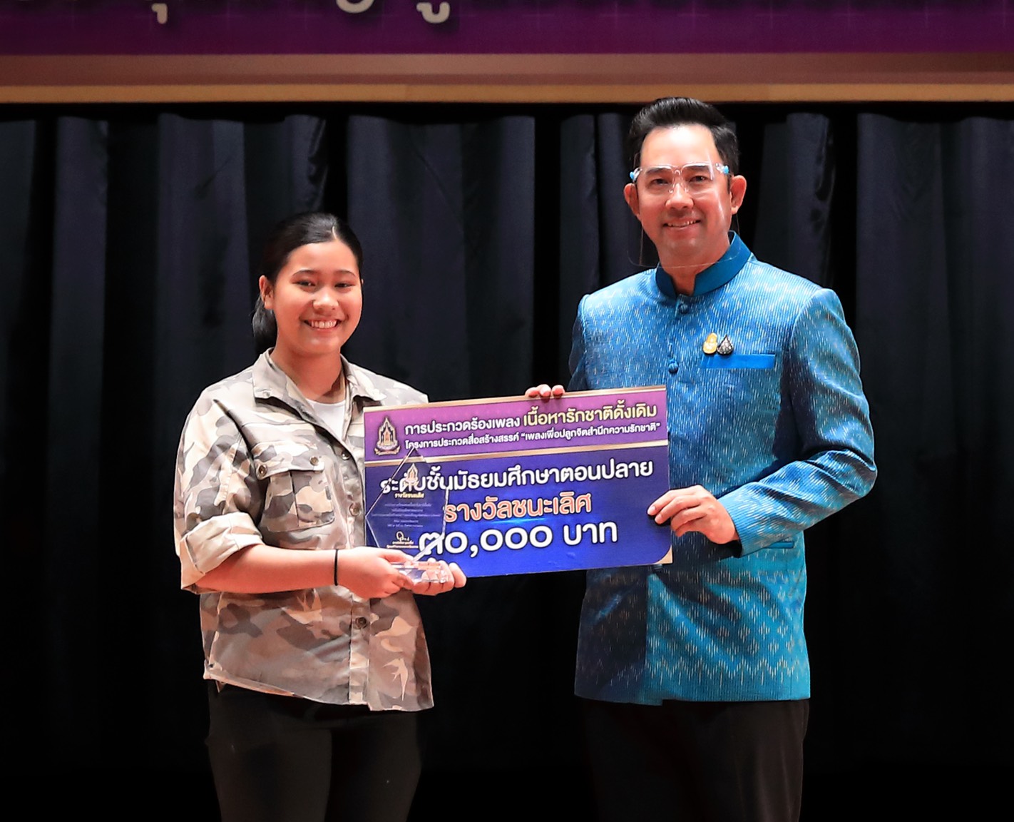 ผู้ชนะเลิศการประกวดเพลงเนื้อหารักชาติที่สร้างสรรค์ใหม่ ระดับมัธยมศึกษาตอนปลาย ได้รับเงินรางวัล 50,000 บาท และโล่เชิดชูเกียรติ ได้แก่ นางสาวพิมพ์วลัญช์ ดุษฎีปรีชา ในบทเพลง เก็บแผ่นดิน รางวัลชมเชย ได้รับเงินรางวัล 5,000 บาท และโล่เชิดชูเกียรติ ได้แก่ นายคฑาวุธ เถื่อนประยูร ในบทเพลง ตามรอยมหาราช นางสาวธัญญารัตน์ เนียมหอม ในบทเพลง ใต้ร่มไตรรงค์ และนายธรรมรัตน์ หรั่งเจริญ ในบทเพลง รักชาติไทย รางวัลขวัญใจมหาชน ได้รับเงินรางวัล 10,000 บาท และโล่เชิดชูเกียรติ ได้แก่ นายคฑาวุธ เถื่อนประยูร ใบบทเพลง ตามรอยมหาราช