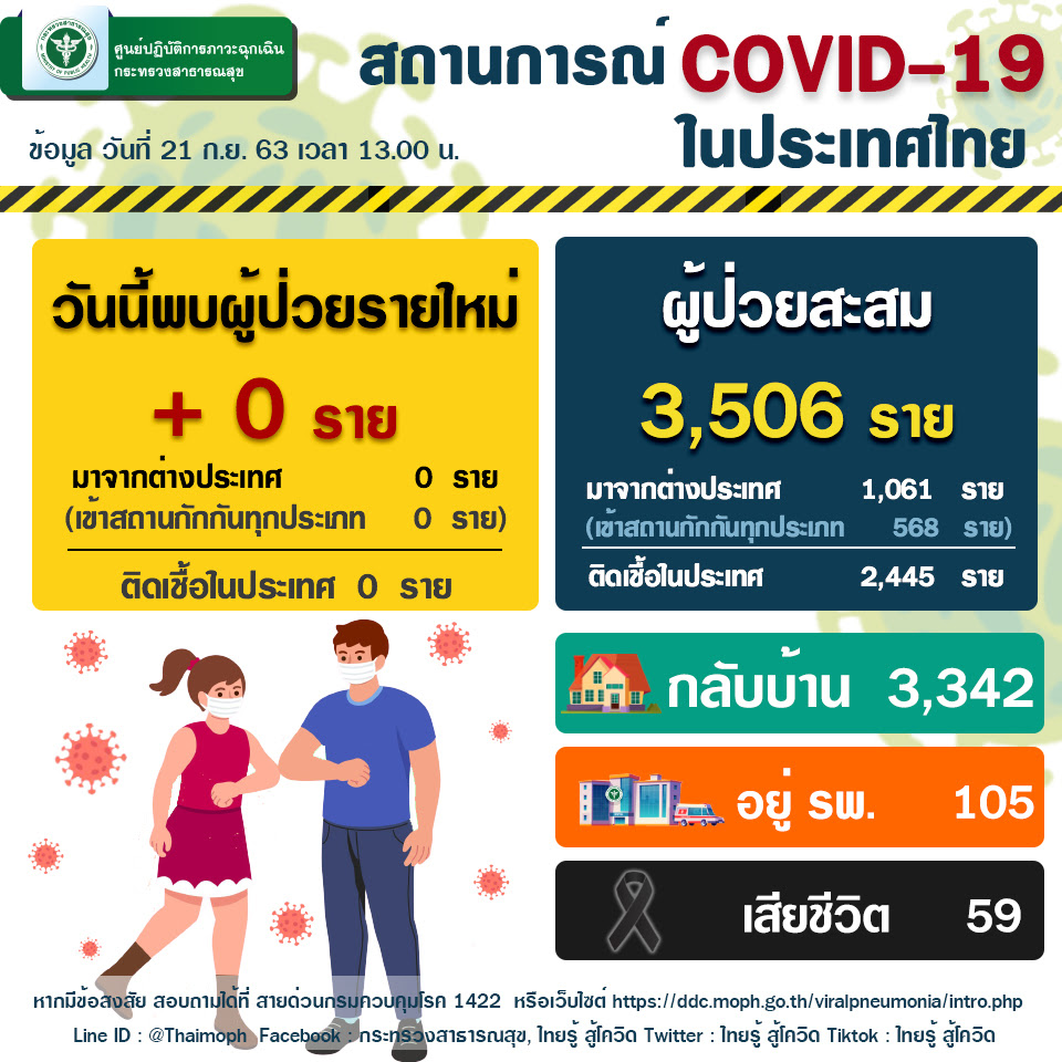 กระทรวงสาธารณสุข (สธ.) รายงานข่าวกรณีโรคติดเชื้อไวรัสโคโรนา 2019 (COVID-19) ประจำวันที่ 21 กันยายน 2563 ว่า สถานการณ์ผู้ติดเชื้อไวรัสโคโรนา 2019 ในประเทศไทย วันนี้ (21ก.ย.) ไม่มีผู้ติดเชื้อรายใหม่ มีผู้ป่วยกลับบ้านได้ 2 ราย ทำให้มีผู้ป่วยกลับบ้านสะสม 3,342 ราย หรือคิดเป็นร้อยละ 95.32 ของผู้ป่วยทั้งหมด มีผู้ป่วยที่ยังรักษาอยู่ในโรงพยาบาล 105 ราย หรือร้อยละ 2.99 ของผู้ป่วยทั้งหมด ไม่มีผู้เสียชีวิตเพิ่ม รวมผู้เสียชีวิตสะสม 59 ราย ผู้ป่วยสะสมทั้งสิ้น 3,506 ราย