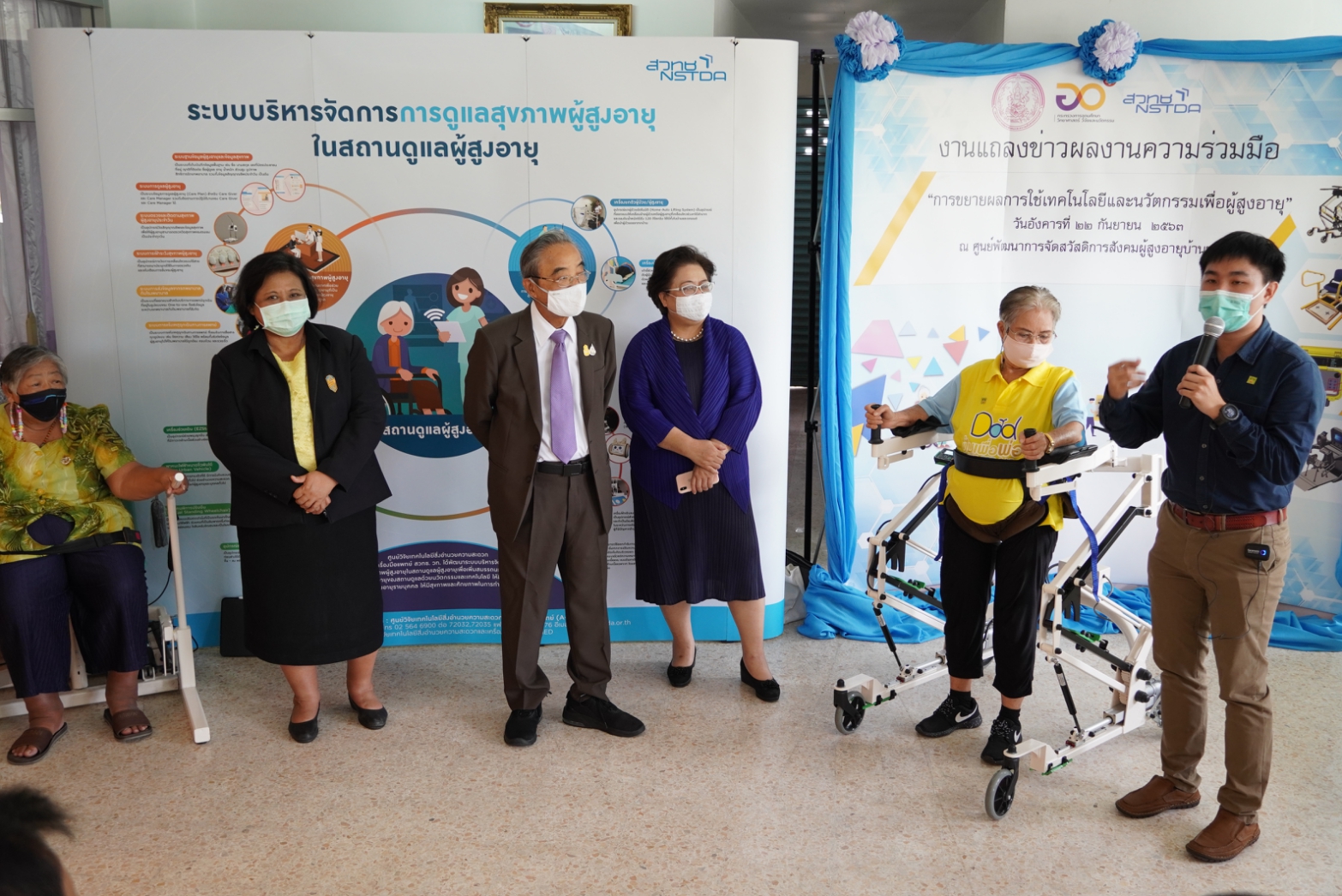 โดย สวทช. ร่วมกับ มหาวิทยาลัยธรรมศาสตร์ เครือข่ายภาคีวิศวกรรมชีวการแพทย์ไทยพัฒนาเครื่องฝึกเดินแบบเคลื่อนที่ได้ (Space walker) อุปกรณ์ช่วยฝึกเดินที่มีระบบพยุงน้ำหนักบางส่วน และเครื่องออกกำลังกายและฟื้นฟู (Sit to Stand Trainer) นวัตกรรมเครื่องออกกำลังกายลุก – นั่ง ที่ผู้สูงอายุสามารถใช้ออกกำลังกายด้วยตัวเอง รวมทั้งการใช้เทคโนโลยีและนวัตกรรมเพื่อดูแลผู้สูงอายุอย่างครบวงจร เช่น การใช้เทคโนโลยี ระบบบริหารจัดการศูนย์ดูแลผู้สูงอายุ การเตรียมโครงสร้างพื้นฐานและระบบเครือข่ายสำหรับระบบระบุตำแหน่งผู้สูงอายุ และ ระบบส่งเสริมสุขภาพและการเฝ้าระวังด้วยอุปกรณ์การบันทึกการเคลื่อนไหวแบบไร้สาย การติดตั้งและใช้งาน เครื่องฝึกเดินแบบเคลื่อนที่ได้ และเครื่องออกกำลังกายและฟื้นฟู ซึ่งจะช่วยเสริมสวัสดิภาพ และกำลังใจให้กับผู้สูงอายุใช้ชีวิตได้อย่างมีความสุขสมวัย