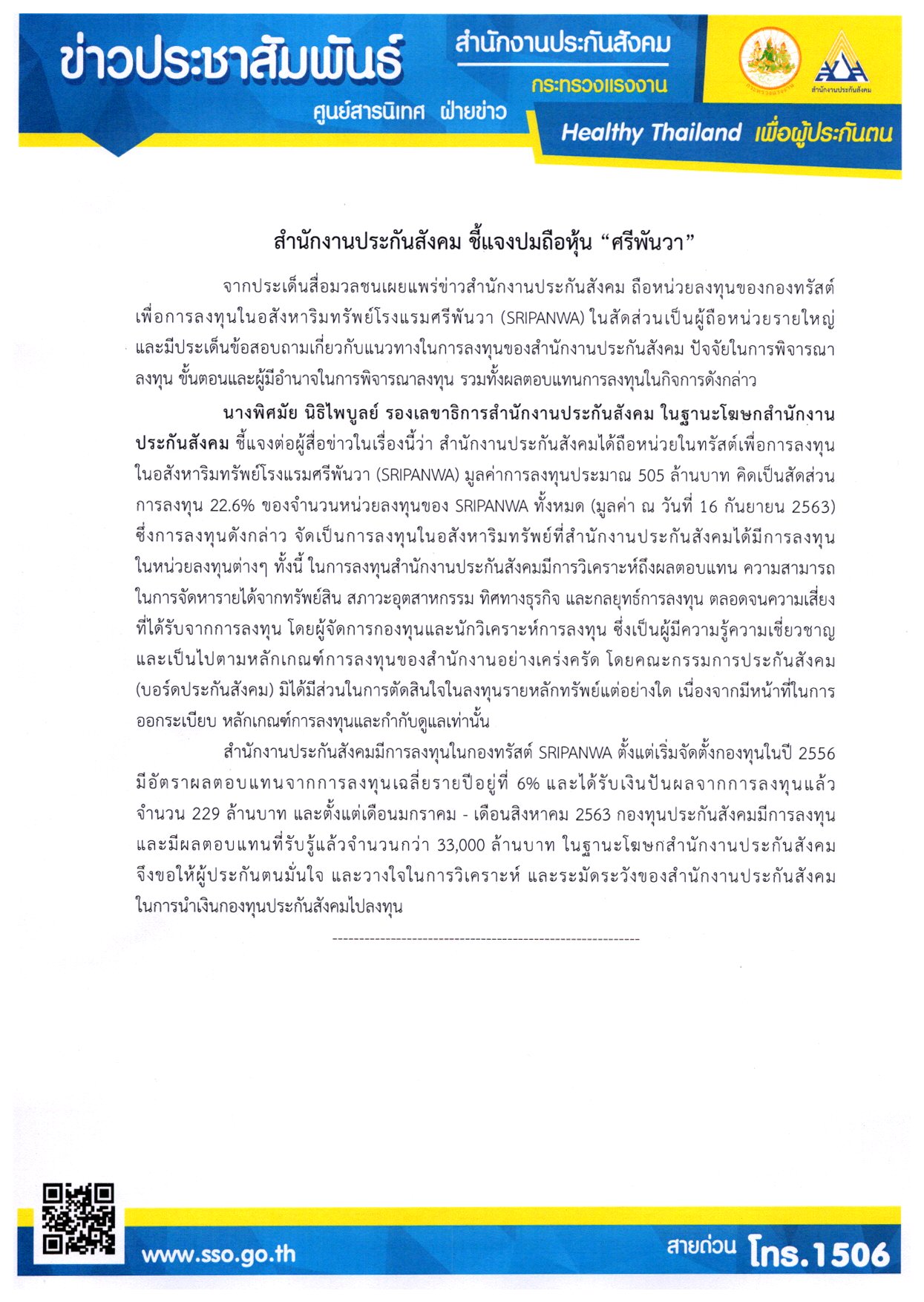 นางพิศมัย นิธิไพบูลย์ รองเลขาธิการสำนักงานประกันสังคม ในฐานะโฆษกสำนักงานประกันสังคม ชี้แจงว่าสำนักงานประกันสังคมได้ถือหน่วยในทรัสต์เพื่อการลงทุน ในอสังหาริมทรัพย์โรงแรมศรีพันวา (SRIPANWA) มูลค่าการลงทุนประมาณ 505 ล้านบาท คิดเป็นสัดส่วน การลงทุน 22.6% ของจำนวนหน่วยลงทุนของ SRIPANWA ทั้งหมด (มูลค่า ณ วันที่ 16 ก.ย.63) ซึ่งการลงทุนดังกล่าว จัดเป็นการลงทุนในอสังหาริมทรัพย์ที่สำนักงานประกันสังคมได้มีการลงทุน ในหน่วยลงทุนต่างๆ