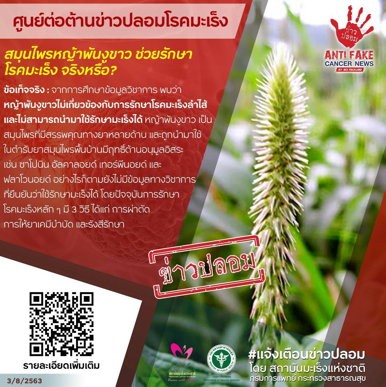 ตามที่มีข่าวปรากฏในสื่อต่างๆ เกี่ยวกับประเด็นเรื่อง “หญ้าพันงูขาวช่วยรักษาโรคมะเร็งลำไส้” กรมการแพทย์ โดยสถาบันมะเร็งแห่งชาติ ได้ดำเนินการตรวจสอบข้อเท็จจริง พบว่า หญ้าพันงูขาวไม่เกี่ยวข้องกับการรักษาโรคมะเร็งลำไส้และไม่สามารถนำมาใช้รักษามะเร็งได้
