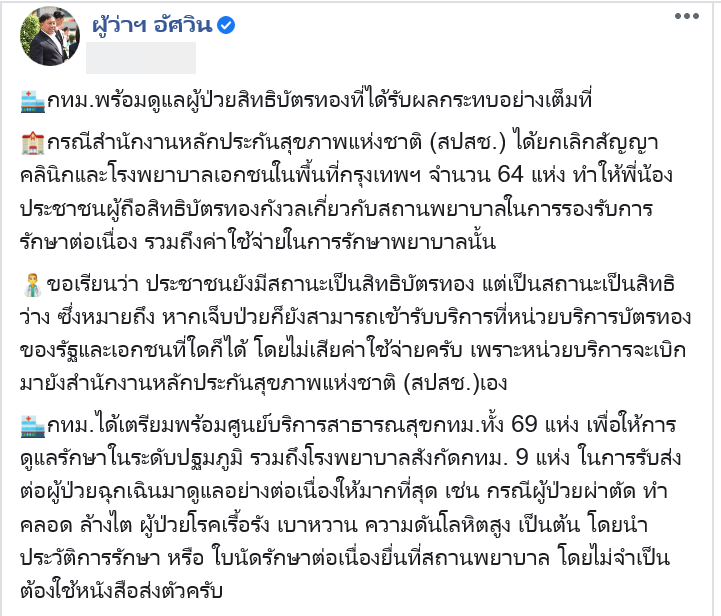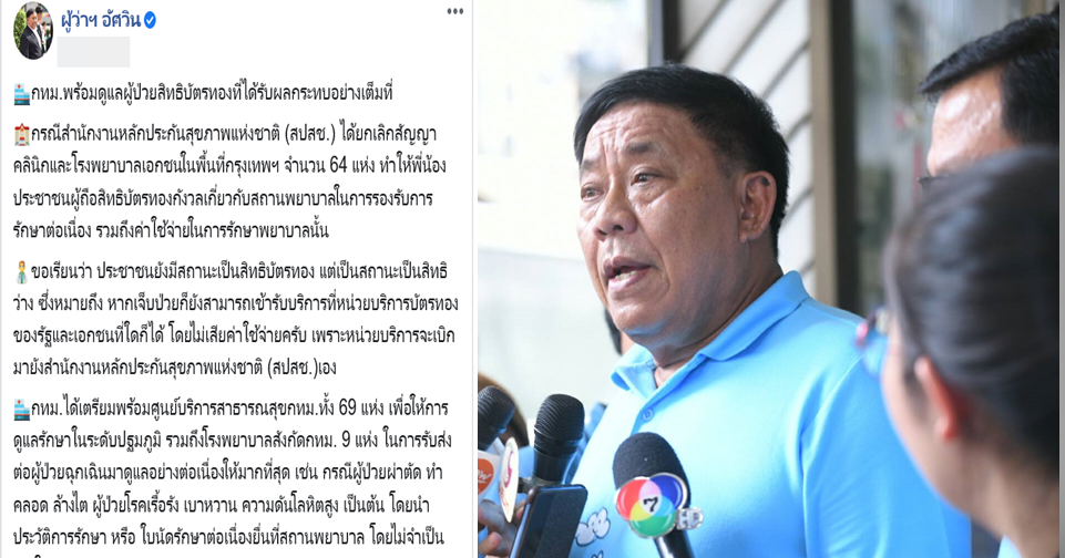 พล.ต.อ.อัศวิน ขวัญเมือง ผู้ว่าราชการกรุงเทพมหานคร (ผู้ว่าฯกทม.) โพสต์ผ่านเพจเฟซบุ๊ก “ผู้ว่าฯอัศวิน”ว่า กรณีสำนักงานหลักประกันสุขภาพแห่งชาติ (สปสช.) ได้ยกเลิกสัญญาคลินิกและโรงพยาบาลเอกชนในพื้นที่กรุงเทพฯ จำนวน 64 แห่ง ทำให้พี่น้องประชาชนผู้ถือสิทธิบัตรทองกังวลเกี่ยวกับสถานพยาบาลในการรองรับการรักษาต่อเนื่อง รวมถึงค่าใช้จ่ายในการรักษาพยาบาลนั้น