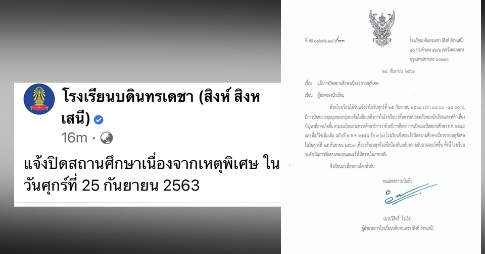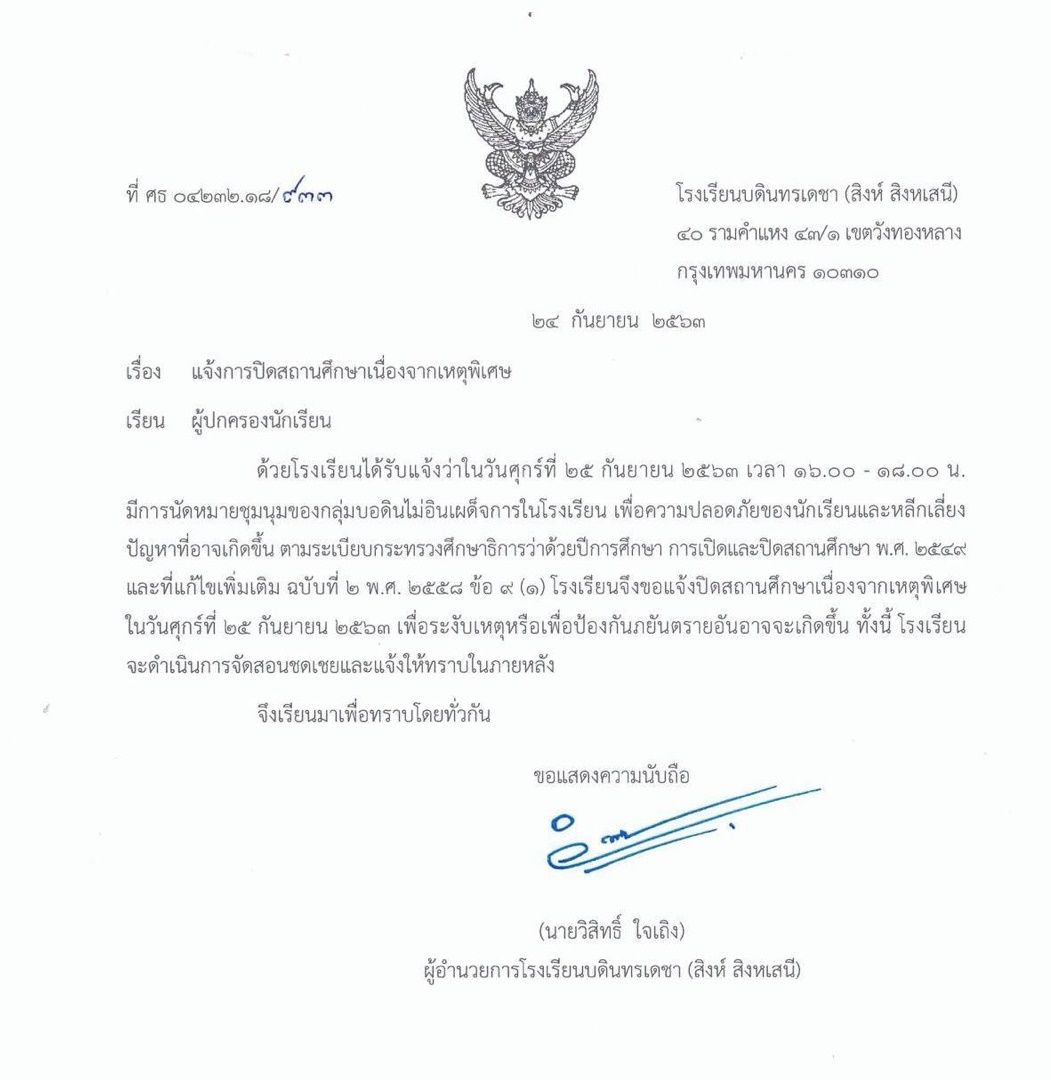กรุงเทพฯ 24 ก.ย.-รร.บดินทรเดชา(สิงห์ สิงหเสนี) ออกประกาศแจ้งปิดสถานศึกษาในวันพรุ่งนี้ เพื่อความปลอดภัยของนักเรียน หลังมีการนัดหมายการชุมนุมภายในโรงเรียน