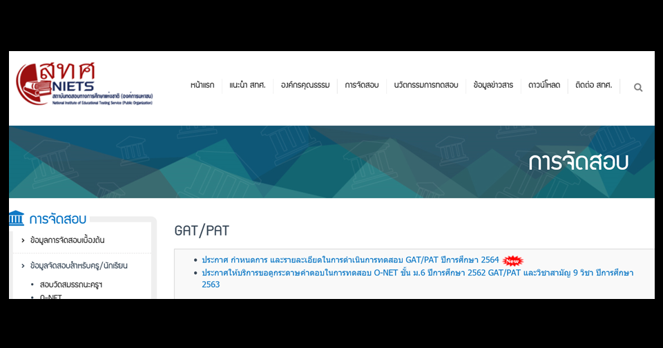 สถาบันทดสอบทางการศึกษาแห่งชาติ (องค์การมหาชน) หรือ สทศ. ออกประกาศผ่านเวบไซต์ สทศ.วันนี้ (25 ก.ย.) โดย ผศ.ดร.ศิริดา บุรชาติ ผู้อำนวยการสถาบันทดสอบทางการศึกษาแห่งชาติ (องค์การมหาชน) เรื่อง กำหนดการและรายละเอียดในการดำเนินการให้บริการการทดสอบความถนัดทั่วไป (GAT) และความถนัดทางวิชาการและวิชาชีพ (PAT) ประจำปีการศึกษา 2564