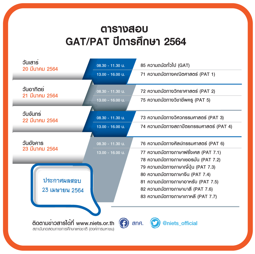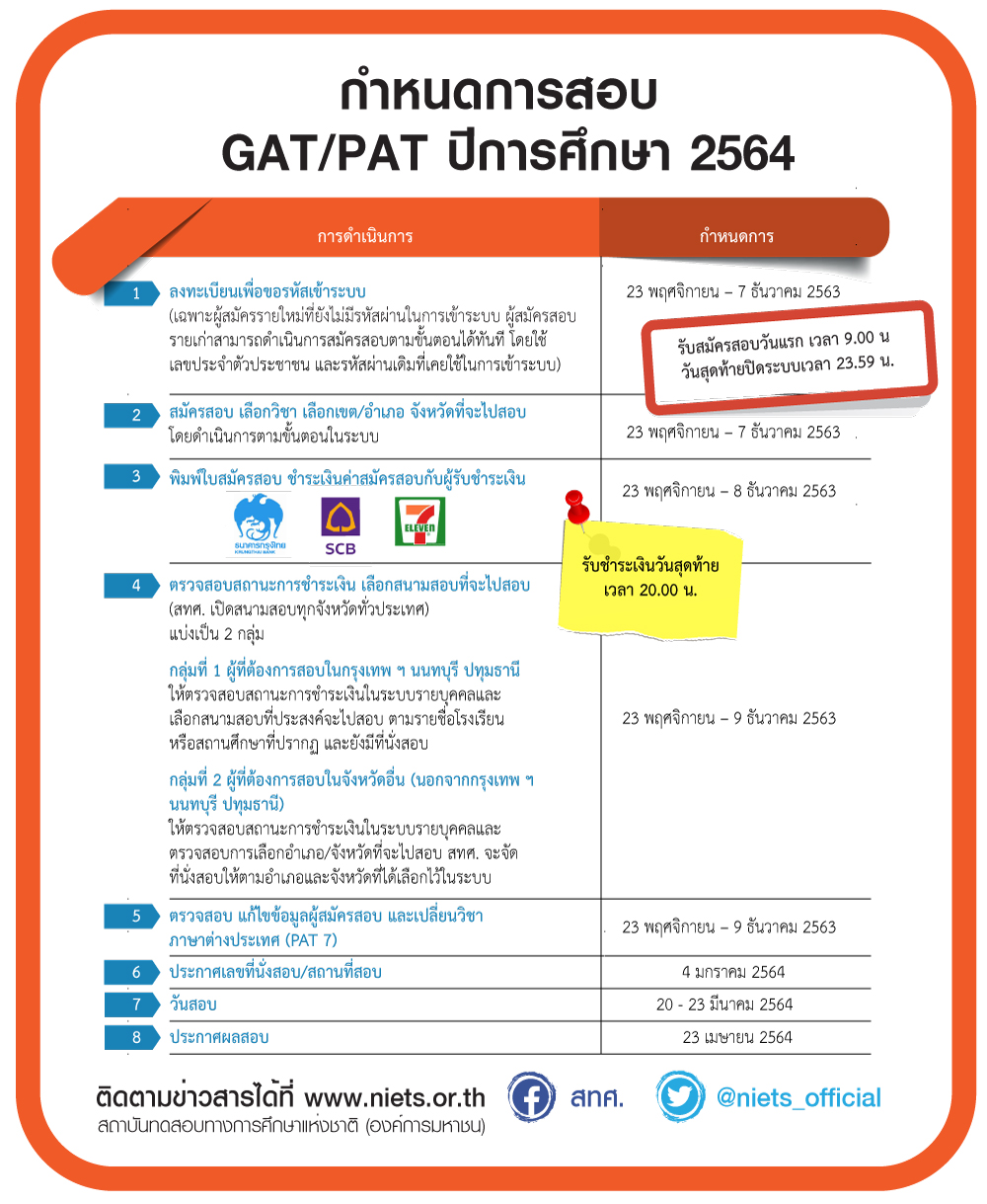 สำนักข่าวไทย 25 ก.ย.-สทศ.เผยกำหนดการรับสมัครสอบ GAT/PAT ปี64 เปิดสมัคร 23 พ.ย.-7 ธ.ค.63 เลือกสนามสอบได้ถึง 9 ธ.ค.63 ประกาศเลขที่นั่งสอบและสถานที่สอบ 4 ม.ค.64 และทดสอบ 20-23 มี.ค.64 ประกาศผลสอบ 23 เม.ย.64