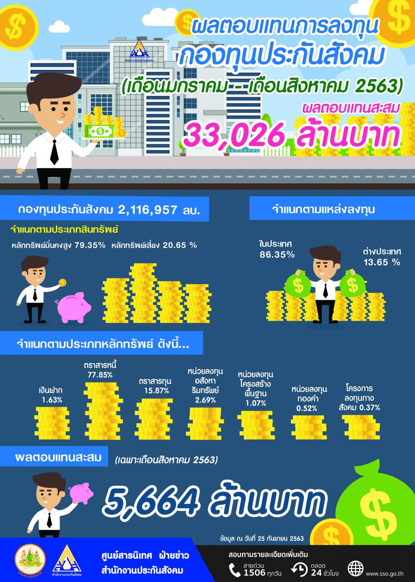 สปส.26 ก.ย.-ประกันสังคม แจงเริ่มลงทุนตั้งแต่ปี 56 มูลค่าการลงทุน 505 ล้าน ยัน กองทุนมีเงินเพียงพอจ่ายบำนาญในระยะยาวให้ลูกจ้าง ผู้ประกันตน ยอดเงินปันผลและกำไร จากการขายรวมทั้งสิ้น 232.62 ล้านบาท