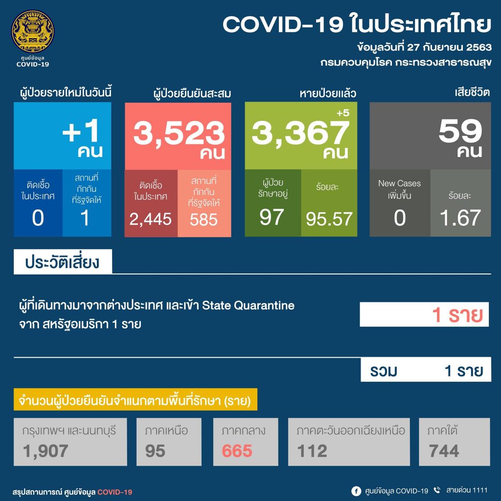 ศูนย์บริการสถานการณ์โควิด-19 (ศบค.) รายงานสถานการณ์การติดเชื้อโควิด -19 ในไทย พบว่ามีผู้ป่วยติดเชื้อรายใหม่ เพิ่มอีก 1 คน เป็นชายไทย เดินทางกลับมาจากสหรัฐอเมริกา อยู่ใน State quarantine ไม่มีอาการ ทำให้ยอดผู้ป่วยติดเชื้อสะสมรวม 3,523 คน ส่วนยอดผู้ป่วยรักษาหายแล้วเดินทางกลับบ้าน มี 5 คน ทำให้มียอดรวม 3,367 คน เหลือรักษาตัวในโรงพยาบาล 97 คน เสียชีวิตรวม 59 คน