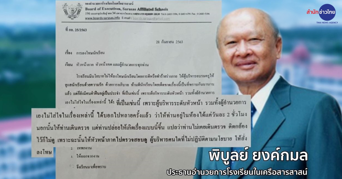 ด้านนายพิบูลย์ ยงค์กมล ประธานอำนวยการโรงเรียนในเครือสารสาสน์ ส่งหนังสือถึงหัวหน้าภาค หัวหน้าเขต และผู้อำนวยการทุกท่าน โดยระบุว่า เรื่องการลงโทษนักเรียน มีนโยบายไม่ให้ตีหรือทำร้ายร่างกาย ซึ่งเรื่องนี้เป็นที่ทราบกันมานานแล้ว แต่ยังมีการฝ่าฝืนกันเป็นประจำ และที่เป็นเช่นนี้ เพราะผู้บริหารระดับหัวหน้า รวมทั้งผู้อำนวยการไม่ใส่ใจ เคยบอกหลายครั้งแล้วว่าให้อยู่ในห้องได้แค่วันละ 2 ชั่วโมง นอกนั้นให้เดินตรวจ แต่กลับปล่อยให้เกิดเรื่องขึ้น แปลว่าไม่เคยเดินตรวจ หรือติดกล้องไว้ก็ไม่ดู ฉะนั้นให้หัวหน้าภาคไปตรวจสอบ หากผู้บริหารคนใดไม่ปฏิบัติตามนโยบายให้สั่งลงโทษ ดังนี้ 1.ทำทัณฑ์บน 2.ให้พักงาน 3.ให้ออกจากงาน. – สำนักข่าวไทย