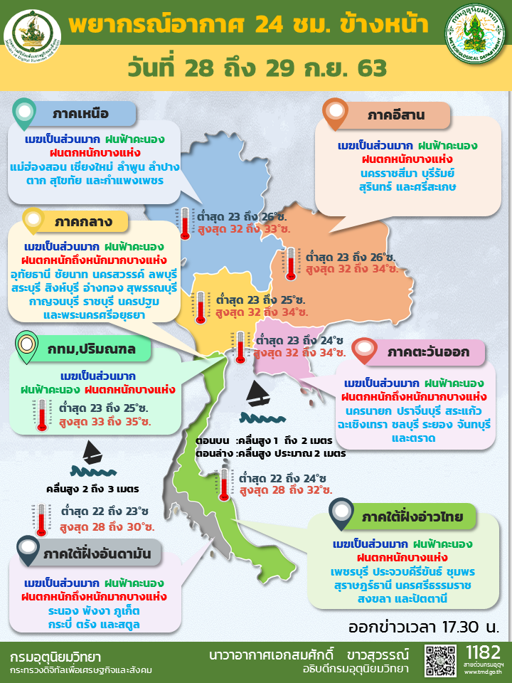 กรมอุตุนิยมวิทยา พยากรณ์อากาศ 24 ชั่วโมงข้างหน้า ร่องมรสุมเลื่อนขึ้นไปพาดผ่านภาคเหนือตอนล่าง ภาคกลางตอนบน และภาคตะวันออกเฉียงเหนือตอนล่างเข้าสู่หย่อมความกดอากาศต่ำบริเวณทะเลจีนใต้ตอนกลาง ในขณะที่มรสุมตะวันตกเฉียงใต้ที่พัดปกคลุมทะเลอันดามัน ประเทศไทย และอ่าวไทยยังคงมีกำลังแรง ทำให้ประเทศไทยยังคงมีฝนตกหนักบางแห่งบริเวณภาคเหนือ ภาคตะวันออกเฉียงเหนือ ภาคกลาง ภาคตะวันออก และภาคใต้ฝั่งตะวันตก ขอให้ประชาชนที่อาศัยในพื้นที่เสี่ยงภัยในภาคเหนือ ภาคตะวันออก และภาคใต้ ระวังอันตรายจากฝนที่ตกหนักและฝนที่ตกสะสมไว้ด้วย