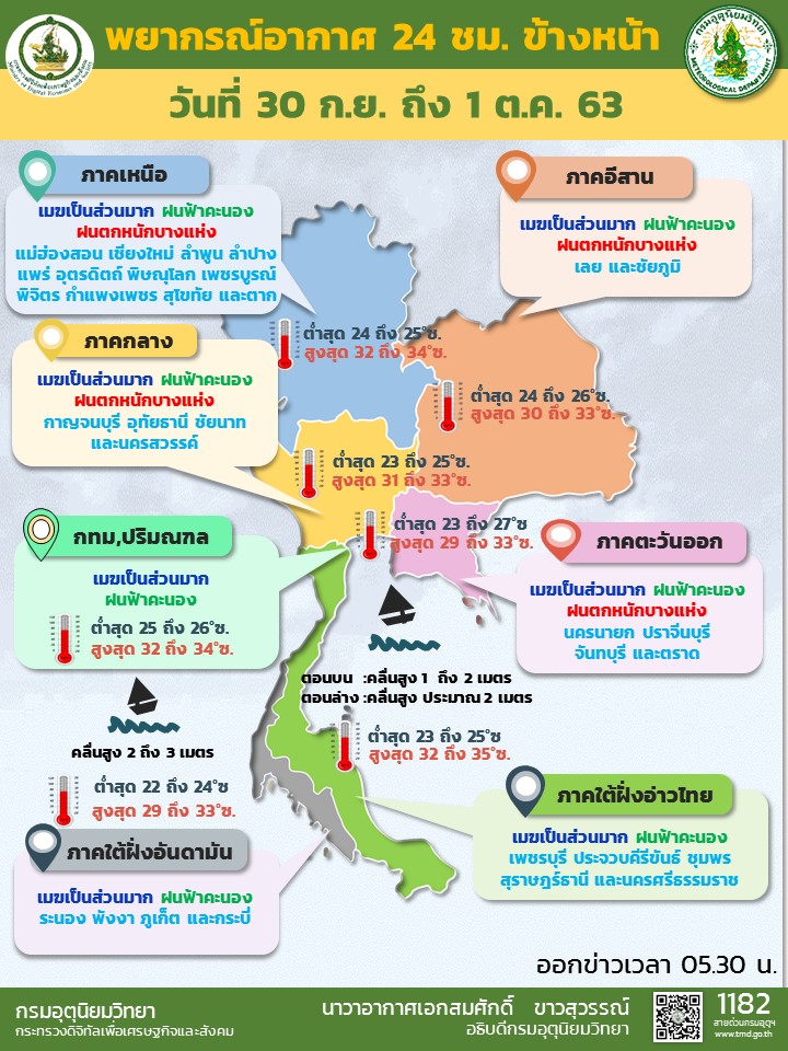 กทม. 30 ก.ย.-กรมอุตุฯ ระบุไทยยังคงมีฝนตกต่อเนื่อง และมีฝนตกหนักบางแห่งบริเวณภาคเหนือ ภาคตะวันออกเฉียงเหนือ ภาคกลาง และภาคตะวันออก ทะเลอันดามันตอนบนคลื่นสูงประมาณ 2 เมตร ส่วนกรุงเทพฯ และปริมณฑล ฝนฟ้าคะนอง 60%