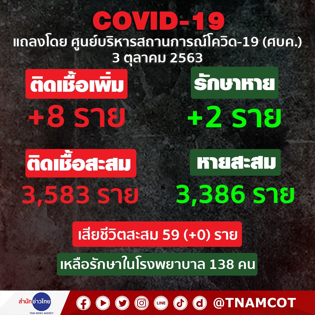 3 ต.ค. – ศูนย์บริหารสถานการณ์แพร่ระบาดของโรคติดเชื้อไวรัสโคโรนา 2019 หรือ ศบค.รายงานสถานการณ์การติดเชื้อ COVID-19 ในไทย วันเสาร์ที่ 3 ตุลาคม 2563 เวลา 11.00 น.