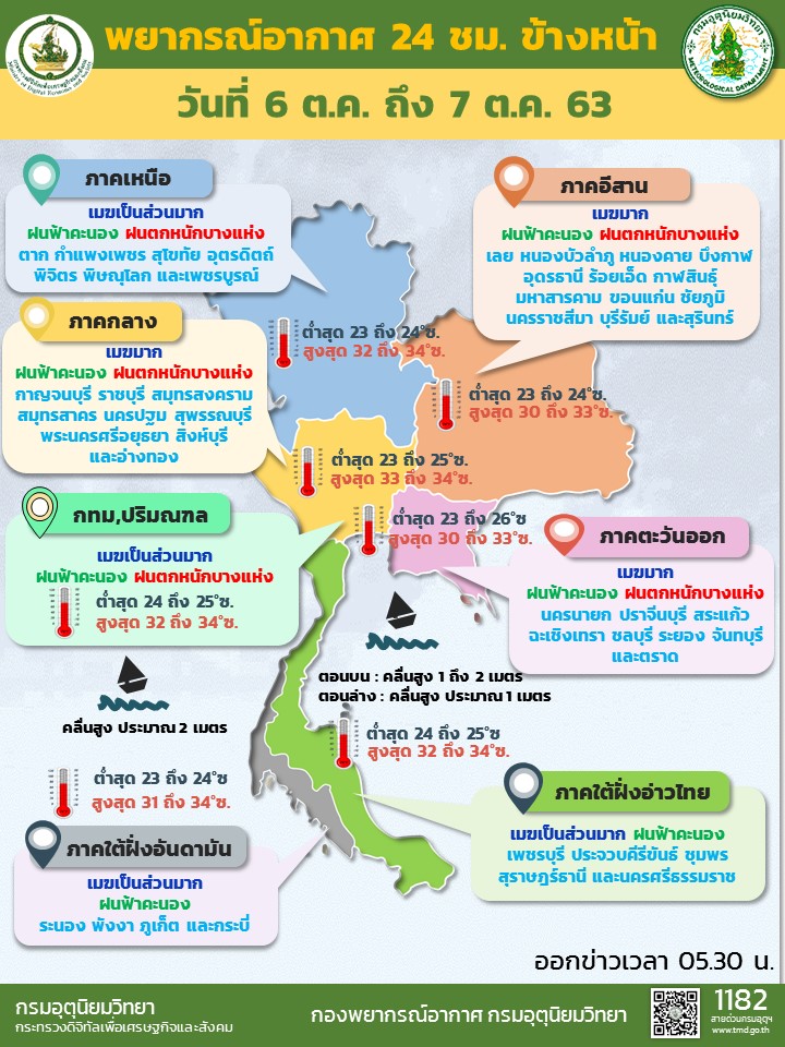 กรมอุตุนิยมวิทยา พยากรณ์อากาศ 24 ชั่วโมงข้างหน้า ร่องมรสุมพาดผ่านภาคกลาง ภาคตะวันออก และภาคตะวันออกเฉียงเหนือตอนล่าง เข้าสู่หย่อมความกดอากาศต่ำกำลังแรงบริเวณทะเลจีนใต้ตอนกลาง ในขณะที่มรสุมตะวันตกเฉียงใต้ที่พัดปกคลุมทะเลอันดามัน ภาคใต้ และอ่าวไทย มีกำลังปานกลาง ทำให้ประเทศไทยยังคงมีฝนตกต่อเนื่อง และมีฝนตกหนักบางแห่ง บริเวณภาคเหนือ ภาคตะวันออกเฉียงเหนือ ภาคตะวันออก และภาคกลาง รวมทั้งกรุงเทพมหานคร และปริมณฑล ขอให้ประชาชนที่อาศัยในพื้นที่เสี่ยงภัยบริเวณภาคเหนือและภาคตะวันออกเฉียงเหนือ ระวังอันตรายจากฝนตกหนักและฝนที่ตกสะสมไว้ด้วย