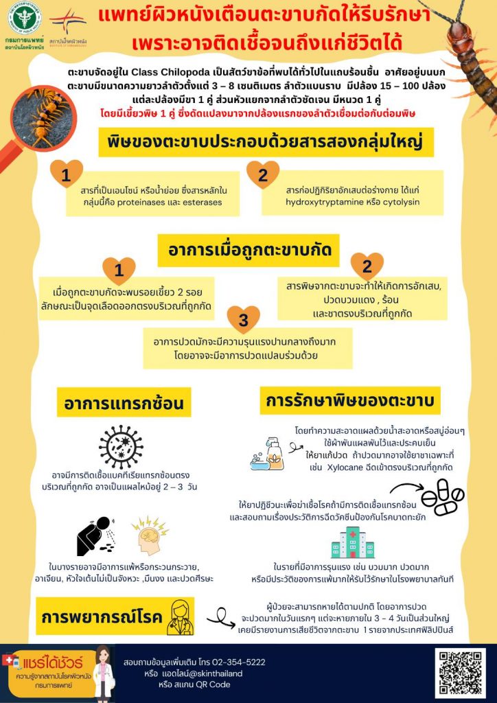 กรุงเทพฯ 8 ต.ค..- กรมการแพทย์ โดยสถาบันโรคผิวหนัง เตือนผู้ที่ถูกตะขาบกัดควรรีบไปพบแพทย์เพื่อรับการตรวจรักษา เพราะอาจมีความเสี่ยงจากการติดเชื้อเข้าสู่กระแสเลือดจนถึงขั้นเสียชีวิตได้