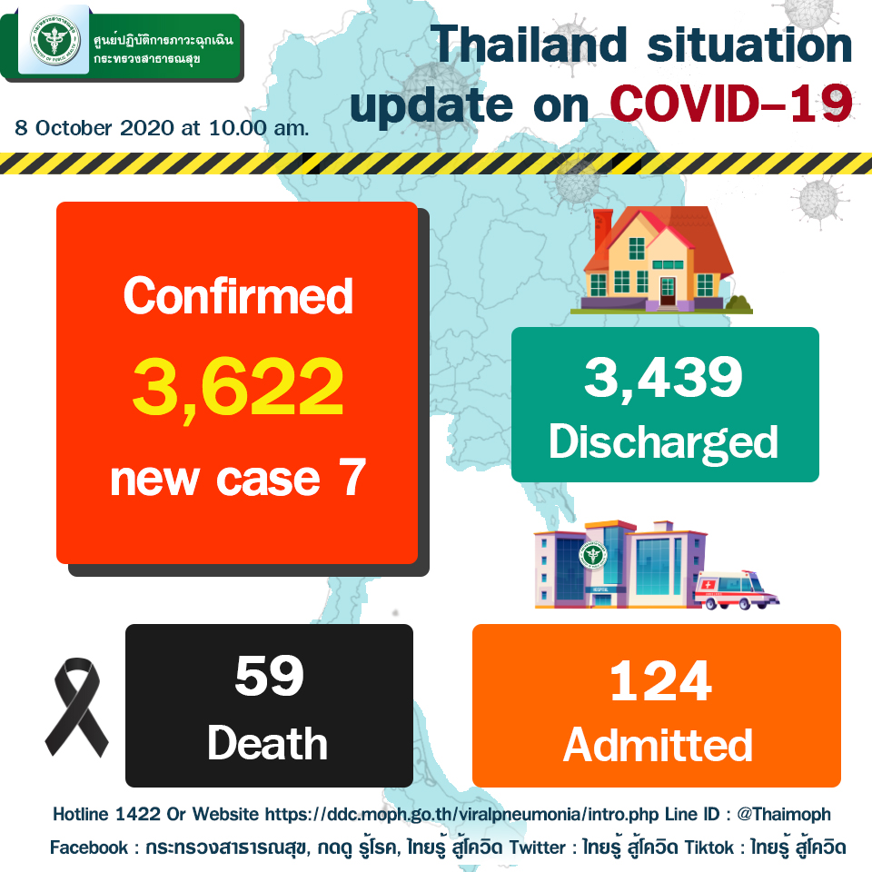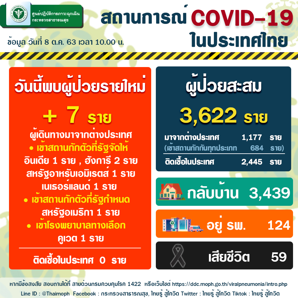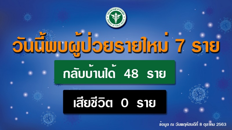 กระทรวงสาธารณสุข (สธ.) รายงานข่าวกรณีโรคติดเชื้อไวรัสโคโรนา 2019 (COVID-19) ประจำวันที่ 8 ตุลาคม 2563 ว่า สถานการณ์ผู้ติดเชื้อไวรัสโคโรนา 2019 ในประเทศไทยวันนี้ มีผู้ติดเชื้อรายใหม่ 7 ราย เป็นผู้เดินทางจากต่างประเทศ (สหรัฐอเมริกา 1 ราย, อินเดีย 1 ราย, สหรัฐอาหรับเอมิเรตส์ 1 ราย, ฮังการี 2 ราย, เนเธอแลนด์ 1 ราย, คูเวต 1 ราย) ทุกรายเข้ากักตัวในสถานที่รัฐจัดให้, สถานกักตัวที่รัฐกำหนด และโรงพยาบาลทางเลือก มีผู้ป่วยกลับบ้านได้ 48 ราย ทำให้ผู้ป่วยกลับบ้านสะสม 3,439 ราย หรือคิดเป็นร้อยละ 94.95 ของผู้ป่วยทั้งหมด มีผู้ป่วยที่ยังรักษาอยู่ในโรงพยาบาล 124 ราย หรือร้อยละ 3.42 ของผู้ป่วยทั้งหมด ไม่มีผู้เสียชีวิตเพิ่ม รวมผู้เสียชีวิตสะสม 59 ราย ผู้ป่วยสะสมทั้งสิ้น 3,622 ราย