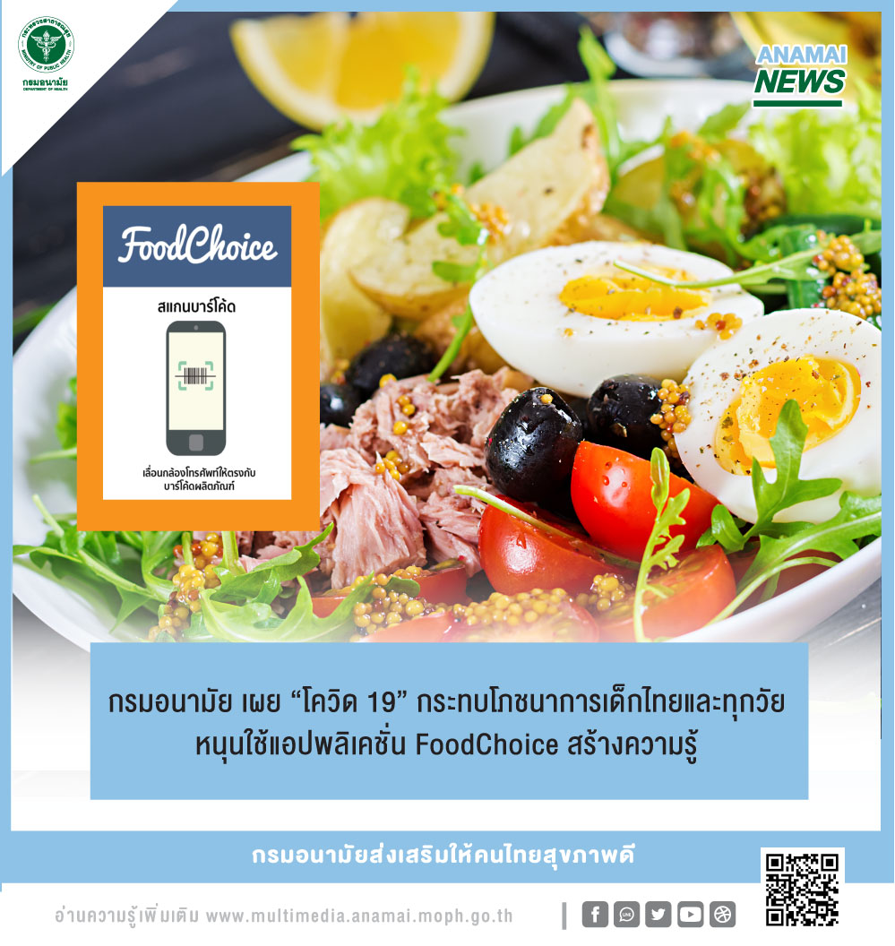 กรมอนามัย 9 ต.ค.-สถานการณ์โรคโควิด-19 ส่งผลกระทบต่อโภชนาการของเด็กไทยและทุกกลุ่มวัย จากการใช้เวลาอยู่บ้านมากขึ้น กินอาหารไม่หลากหลาย กรมอนามัยจัดแอปพลิเคชัน FoodChoice สร้างความรอบรู้ด้านโภชนาการ และความปลอดภัยทางอาหาร