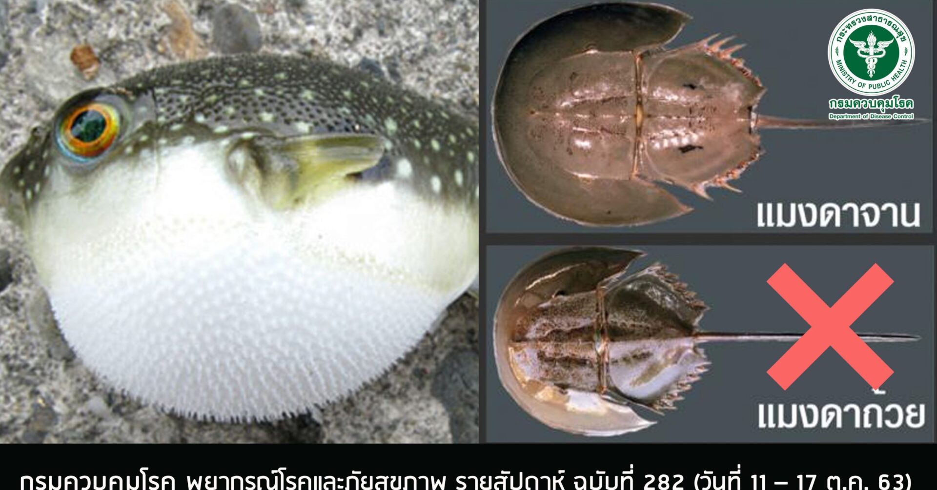 จากการเฝ้าระวังของกรมควบคุมโรค ในช่วง 5 ปีที่ผ่านมาจนถึงปัจจุบัน (ปี 2559-2563) พบเหตุการณ์การรับประทานอาหารทะเลที่มีพิษทุกปี รวม 13 เหตุการณ์ จำแนกเป็น พิษจากแมงดาทะเล 6 เหตุการณ์ พิษจากปลาปักเป้า 7 เหตุการณ์ พบผู้ป่วยรวม 37 ราย มีผู้เสียชีวิต 11 ราย คิดเป็นอัตราป่วยตายสูงถึงร้อยละ 29.7 หรือคิดเป็น 1 ใน 3 ของผู้ที่รับประทานอาหารทะเลที่มีพิษ โดยเหตุการณ์ล่าสุดเมื่อสัปดาห์ที่ผ่านมา มีรายงานผู้ป่วย 1 ราย รับประทานแมงดาทะเล โดยผู้ป่วยมีอาการเวียนศีรษะ ชาที่บริเวณปลายมือและปลายเท้าทั้งสองข้าง และเสียชีวิตในเวลาต่อมา