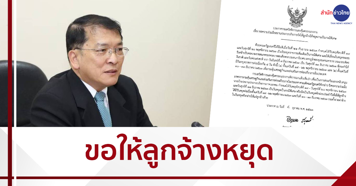 นายอภิญญา กล่าวต่อไปว่า กสร.จึงขอความร่วมมือนายจ้าง สถานประกอบกิจการภาคเอกชน กำหนดให้วันที่ 19-20 พฤศจิกายน 2563 และวันที่ 11 ธันวาคม 2563 เป็นวันหยุดเป็นกรณีพิเศษ หรือจัดให้เป็นวันหยุดพักผ่อนประจำปีเพื่อให้ลูกจ้างได้มีวันหยุดต่อเนื่องและสามารถเดินทางกลับภูมิลำเนา หรือท่องเที่ยวต่างจังหวัด เพื่อเป็นการส่งเสริมและสนับสนุนมาตรการกระตุ้นเศรษฐกิจและส่งเสริมการท่องเที่ยวภายในประเทศตามมติคณะรัฐมนตรีดังกล่าว ทั้งนี้ นายจ้างจะต้องจ่ายค่าจ้างในวันหยุดดังกล่าวให้แก่ลูกจ้างด้วย หากนายจ้าง ลูกจ้าง มีข้อสงสัยสามารถสอบถามได้ที่ สำนักงานสวัสดิการและคุ้มครองแรงงานจังหวัดทุกจังหวัด และสำนักงานสวัสดิการและคุ้มครองแรงงานกรุงเทพมหานคร ทั้ง 10 พื้นที่ หรือสายด่วน 1506 กด 3 .- สำนักข่าวไทย