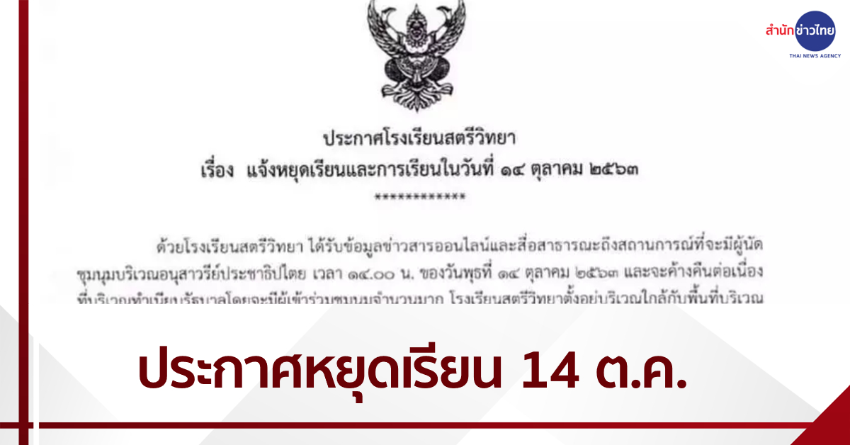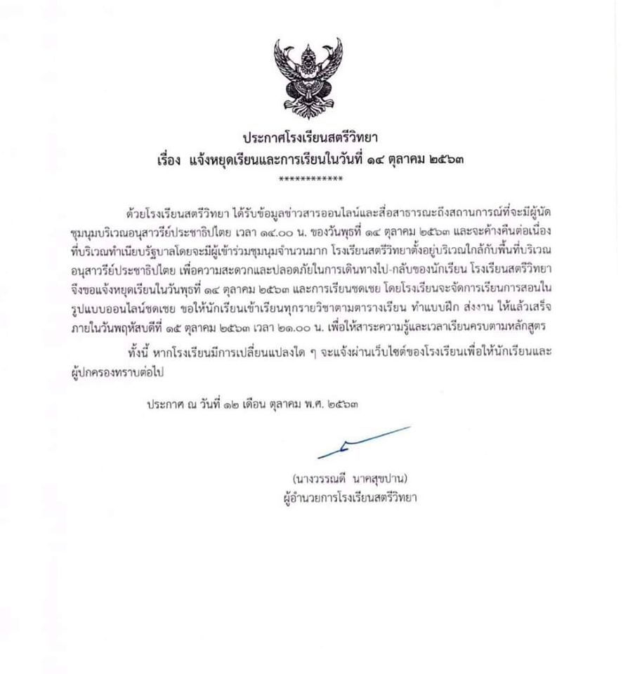 สำนักข่าวไทย 13 ต.ค.-รร.สตรีวิทยา ออกประกาศแจ้งหยุดเรียนวันที่ 14 ต.ค.นี้ เนื่องด้วยจะมีการนัดการชุมนุมบริเวณใกล้เคียงกับโรงเรียน โดยจะจัดการเรียนการสอนในรูปแบบออนไลน์ชดเชย