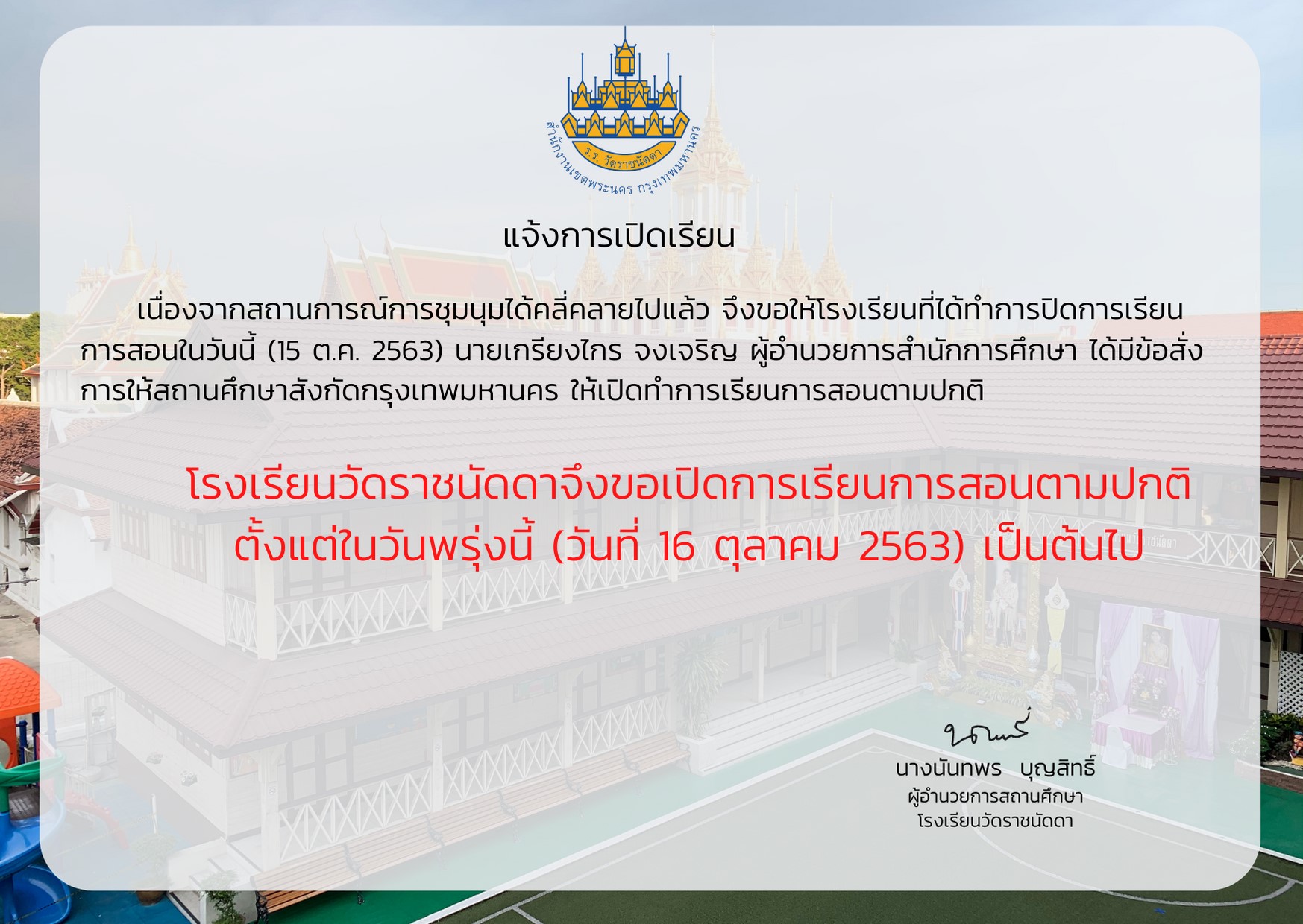 โรงเรียนวัดราชนัดดา สำนักงานเขตพระนคร แจ้งการเปิดเรียน เนื่องจากสถานการณ์การชุมนุมได้คลี่คลายไปแล้ว นายเกรียงไกร จงเจริญ ผอ.สำนักการศึกษา ได้มีข้อสั่งการให้สถานศึกษาสังกัด กทม.ที่ปิดการเรียนการสอนในวันนี้ (15 ต.ค.) ให้เปิดทำการเรียนการสอนตามปกติ ทางโรงเรียนจึงขอเปิดการเรียนการสอนตามปกติ ตั้งแต่วันพรุ่งนี้ (16ต.ค.) เป็นต้นไป