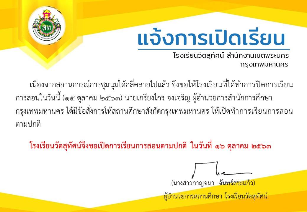 เช่นเดียวกับโรงเรียนวัดสุทัศน์ สำนักงานเขตพระนคร แจ้งการเปิดเรียน ถึงผู้ปกครอง เนื่องจากสถานการณ์การชุมนุมได้คลี่คลายไปแล้ว นายเกรียงไกร จงเจริญ ผู้อำนวยการสำนักการศึกษา กรุงเทพมหานคร ได้มีข้อสั่งการให้สถานศึกษาสังกัด กทม.ให้โรงเรียนที่ทำการปิดการเรียนการสอนในวันที่ 15 ต.ค.63 ให้เปิดทำการเรียนการสอนตามปกติ ทางโรงเรียนจึงขอเปิดการเรียนการสอนตามปกติตั้งแต่วันที่ 16 ตุลาคม 2563 เป็นต้นไป .-สำนักข่าวไทย