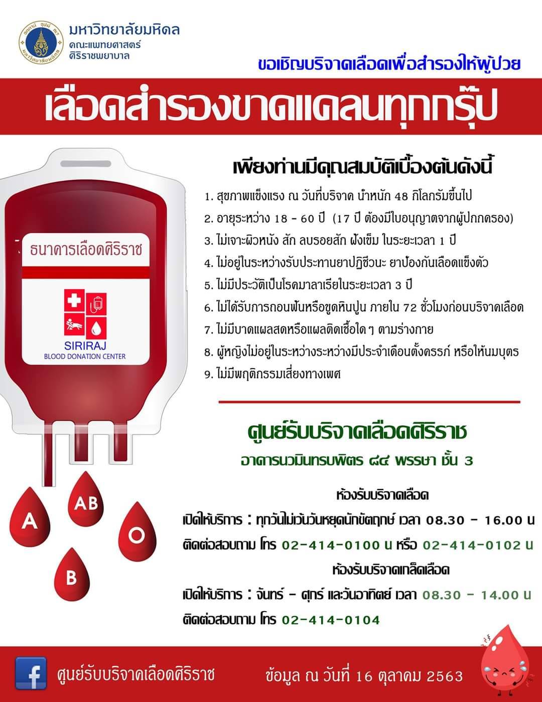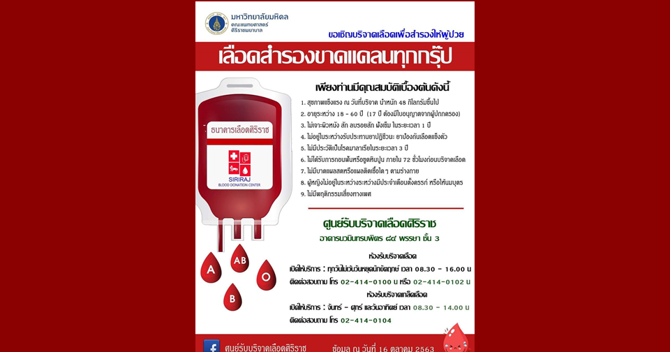 รพ.ศิริราช แจ้งว่า ด้วยขณะนี้ รพ.ศิริราช ขาดแคลนเลือดสำรองทุกกรุ๊ป อาจทำให้ไม่สามารถให้บริการผู้ป่วยได้อย่างต่อเนื่อง ทาง รพ.ศิริราช จึงขอเชิญชวนผู้ใจบุญทุกท่านร่วมบริจาคเลือดช่วยผู้ป่วยฉุกเฉินที่ต้องรับการผ่าตัด ผู้ป่วยโรคเลือดที่จำเป็นต้องใช้เลือด หากมีสุขภาพดี และไม่มีความเสี่ยง มาร่วมช่วยชีวิตคนไทยด้วยกัน ซึ่งศูนย์รับบริจาคเลือดศิริราชมีระบบคัดกรองอย่างปลอดภัยและได้มาตรฐาน โดยวัดอุณหภูมิทั้งเจ้าหน้าที่และผู้บริจาค รวมทั้งทำความสะอาดอุปกรณ์และสถานที่อย่างสม่ำเสมอ