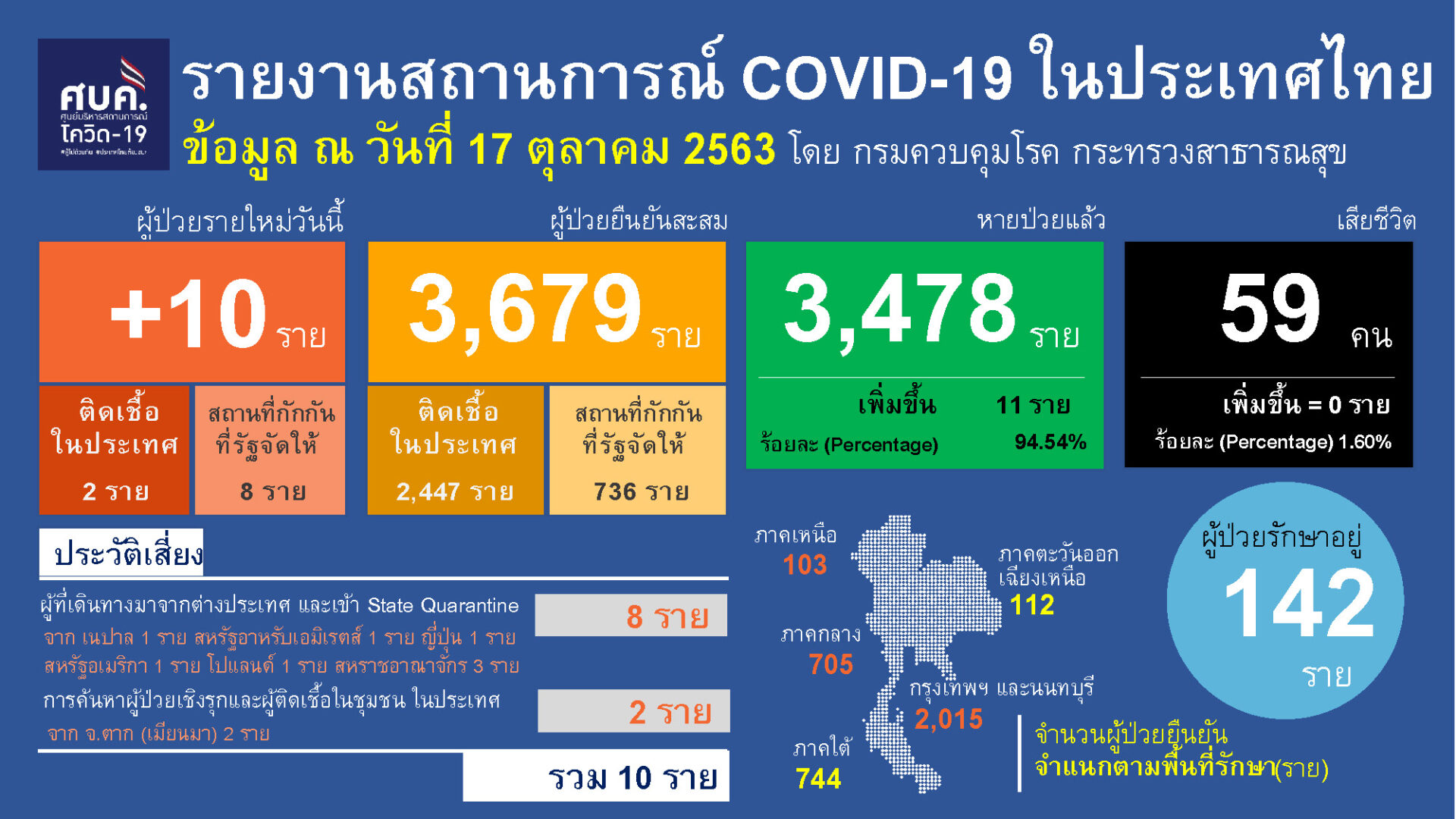 ศูนย์ข้อมูลโควิด-19 รายงานสถานการณ์การติดเชื้อ COVID-19 ในประเทศไทย วันเสาร์ที่ 17 ตุลาคม 2563 พบผู้ป่วยรายใหม่ 10 ราย เป็นผู้เดินทางมาจากต่างประเทศ เนปาล 1 ราย สหรับอาหรับเอมิเรตส์ 1 ราย ญี่ปุ่น 1 ราย สหรัฐ 1 ราย โปแลนด์ 1 ราย สหราชอาณาจักร 3 ราย อยู่ใน State Quarantine ส่วนอีก 2 ราย จากการค้นหาผู้ป่วยเชิงรุกและผู้ติดเชื้อในชุมชนจาก จ.ตาก เป็นชาวเมียนมา ทำให้ยอดผู้ป่วยสะสม 3,679 ราย รักษาหายเพิ่ม 11 คน รวมหายป่วยแล้ว 3,478 ราย เสียชีวิตสะสมคงที่ 59 ราย. – สำนักข่าวไทย