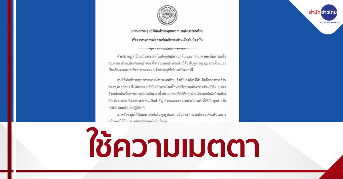 กรุงเทพฯ18 ต.ค.-ศูนย์พิทักษ์พระพุทธศาสนาแห่งประเทศไทย ออกแถลงการณ์ขอทุกฝ่ายใช้เมตตาในทุกรูปแบบ และสนับสนุนให้ใช้วิธีเจรจา แก้ปัญหาบ้านเมือง
