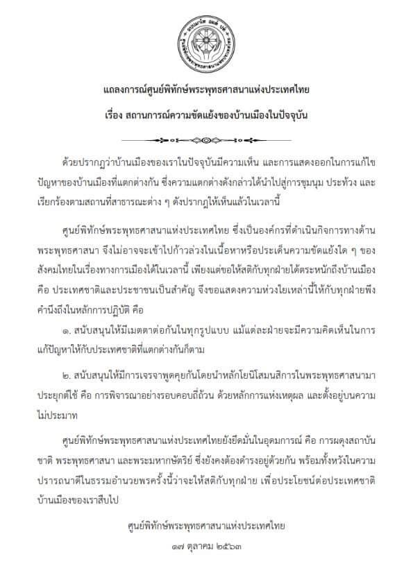 แถลงการณ์ศูนย์พิทักษ์พระพุทธศาสนาแห่งประเทศไทย เรื่อง สถานการณ์ความขัดแย้งของบ้านเมืองในปัจจุบัน มีใจความว่า
