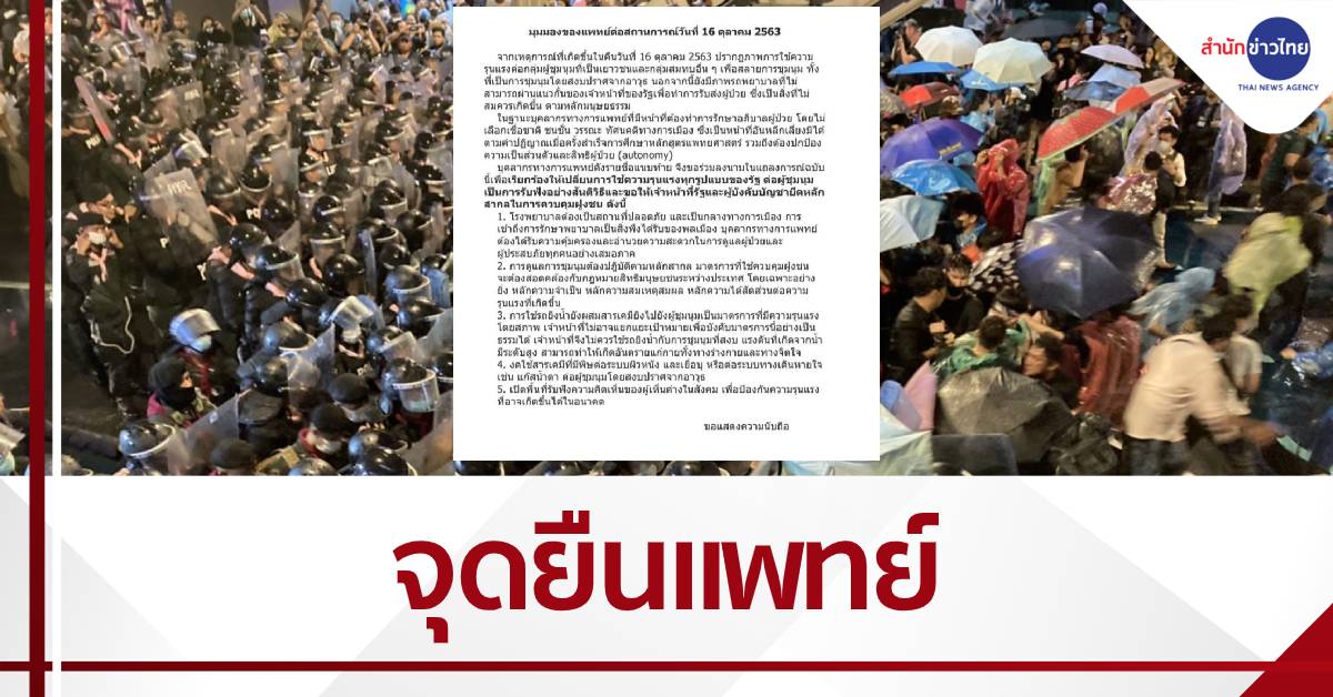 สำนักข่าวไทย 18 ต.ค.- 386 แพทย์ ออกแถลงการณ์ “มุมมองของแพทย์ต่อสถานการณ์การชุมนุม เมื่อวันที่ 16 ต.ค.” เรียกร้องเปลี่ยนการใช้ความรุนแรงทุกรูปแบบของรัฐต่อผู้ชุมนุม เป็นการรับฟังอย่างสันติวิธี
