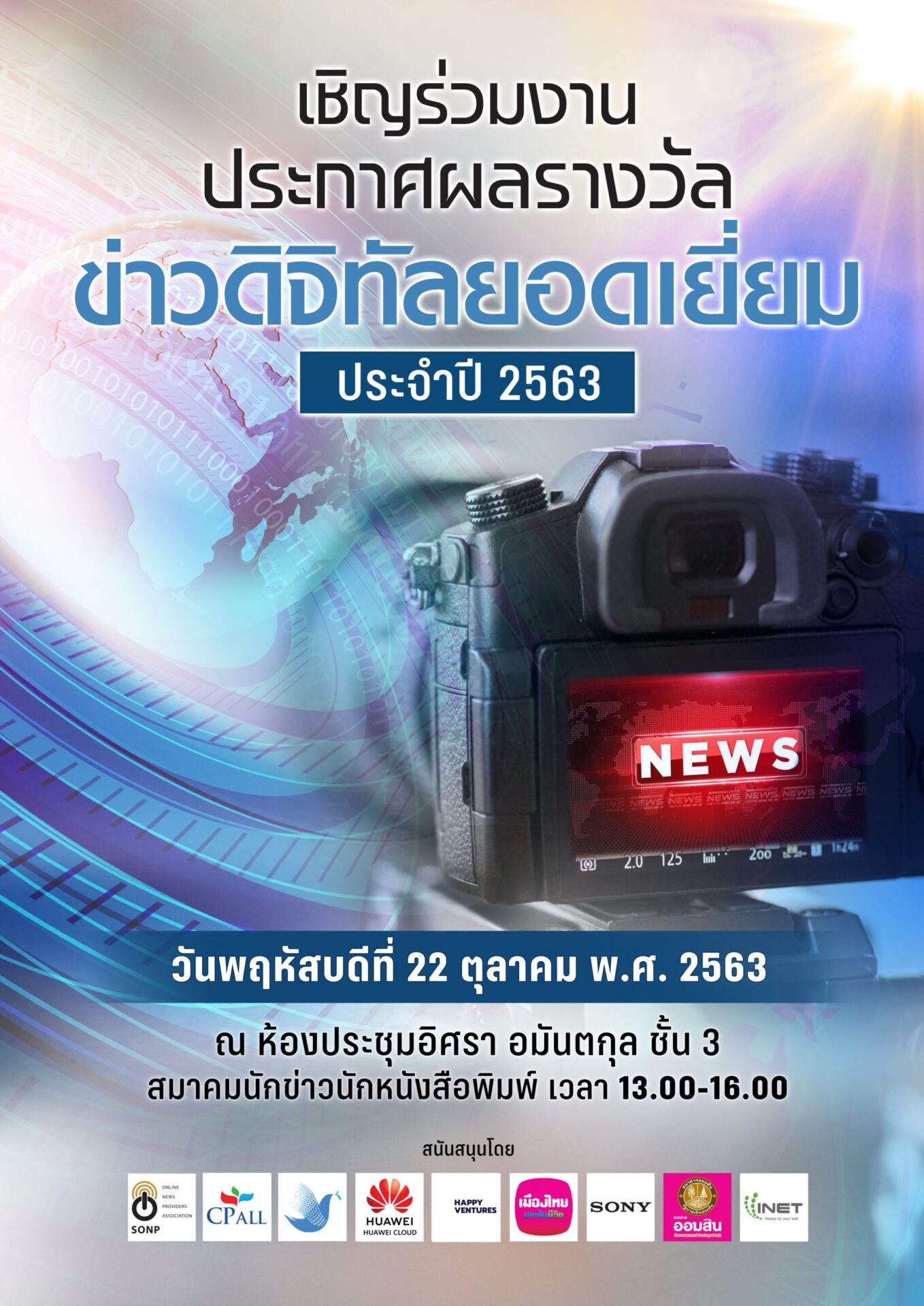 โดยจะมีพิธีมอบรางวัลและโล่เกียรติยศ ในวันพฤหัสบดีที่ 22 ตุลาคม 2563 เวลา 13.00-16.00 น. ณ ห้องประชุมอิศรา อมันตกุล ชั้น 3 สมาคมนักข่าวนักหนังสือพิมพ์แห่งประเทศไทย ในงานมีจัดเสวนา หัวข้อ “Digital News provider movement 2021” โดยได้รับการสนับสนุนจาก บมจ. ซีพี ออลล์ จำกัด, กองทุนพัฒนาสื่อปลอดภัยและสร้างสรรค์, บริษัท หัวเว่ย เทคโนโลยี (ประเทศไทย) จำกัด, HAPPY VENTURES Co., Ltd. บริษัท เมืองไทยประกันชีวิต จำกัด (มหาชน), Sony Thailand Co.,Ltd. ธนาคารออมสิน, บริษัท อินเทอร์เน็ตประเทศไทย จำกัด (มหาชน).-สำนักข่าวไทย