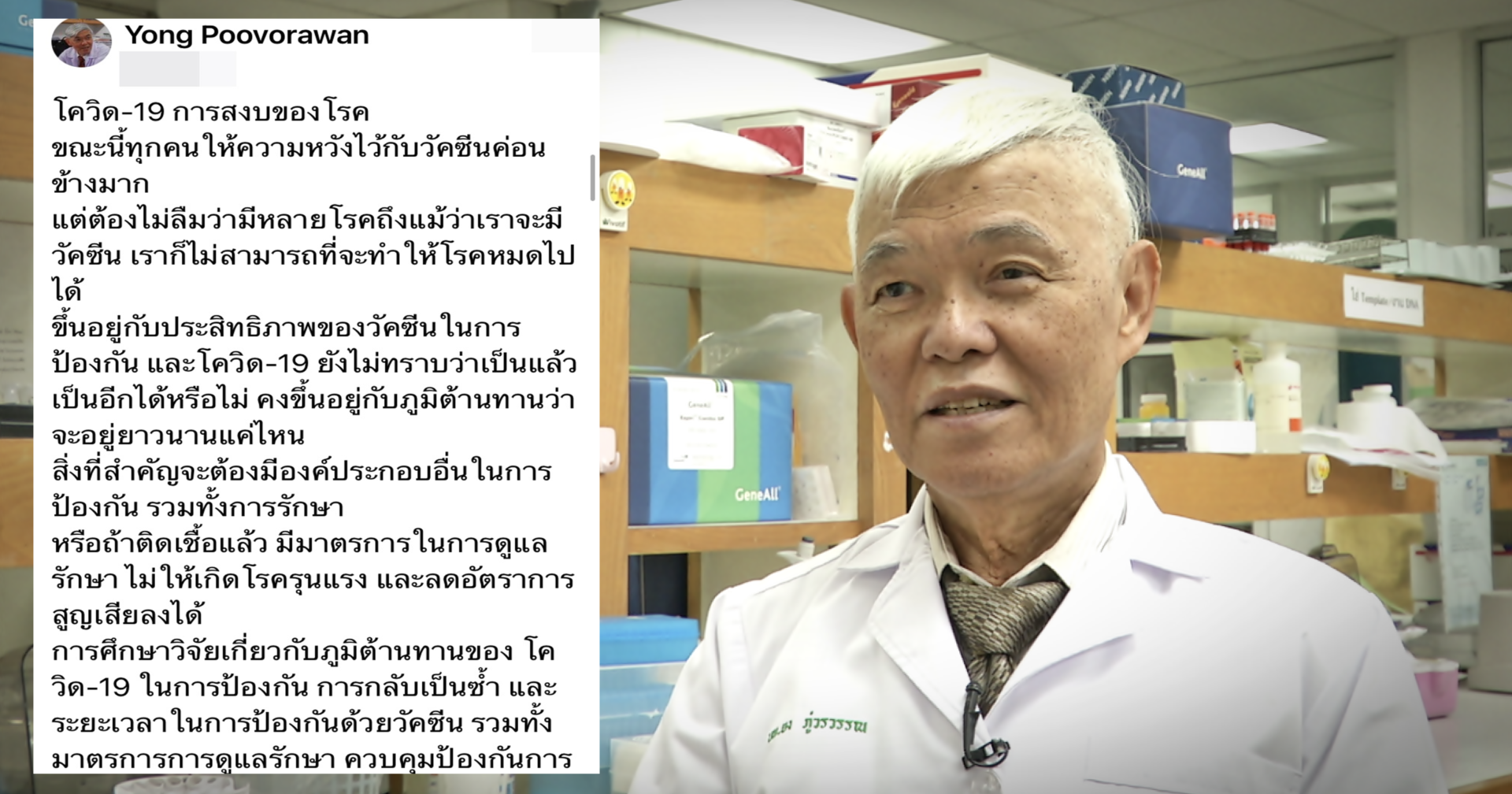 ศ.นพ.ยง ภู่วรวรรณ หัวหน้าศูนย์เชี่ยวชาญเฉพาะทางด้านไวรัสวิทยาคลินิก ภาควิชากุมารเวชศาสตร์ คณะแพทยศาสตร์ จุฬาลงกรณ์มหาวิทยาลัย โพสต์ผ่านเฟซบุ๊กYong Poovorawan ว่า โควิด-19 การสงบของโรค ขณะนี้ทุกคนให้ความหวังไว้กับวัคซีนค่อนข้างมาก แต่ต้องไม่ลืมว่ามีหลายโรคถึงแม้ว่าเราจะมีวัคซีน เราก็ไม่สามารถที่จะทำให้โรคหมดไปได้ ขึ้นอยู่กับประสิทธิภาพของวัคซีนในการป้องกันและโควิด-19 ยังไม่ทราบว่าเป็นแล้วเป็นอีกได้หรือไม่ คงขึ้นอยู่กับภูมิต้านทานว่าจะอยู่ยาวนานแค่ไหน