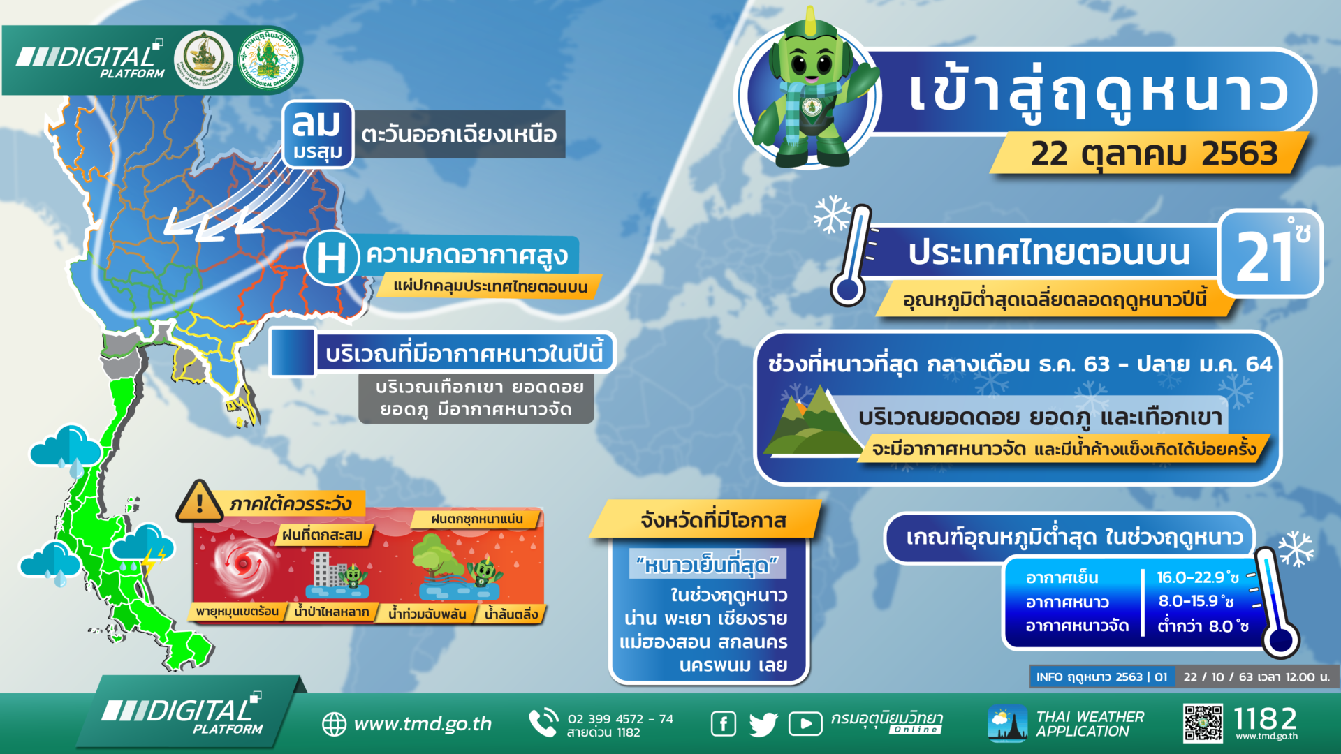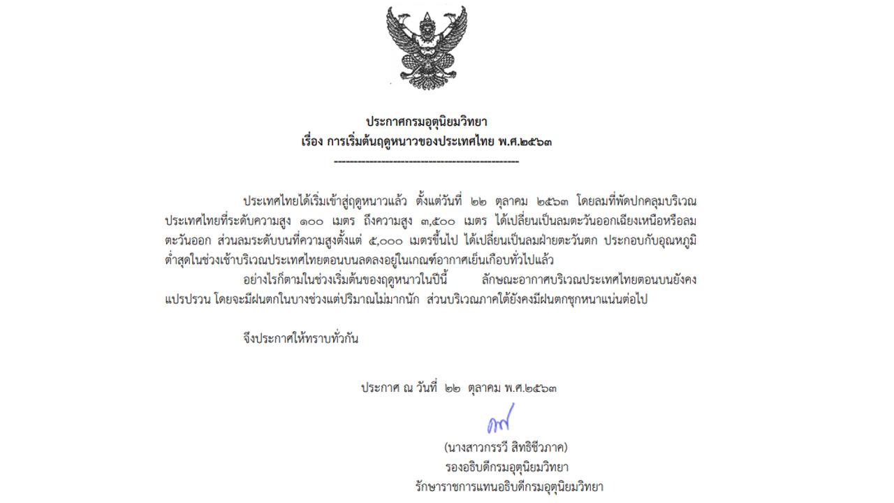 น.ส.กรรวี สิทธิชีวภาค รองอธิบดีกรมอุตุนิยมวิทยา รักษาราชการแทนอธิบดีกรมอุตุนิยมวิทยา ลงนามในประกาศกรมอุตุนิยมวิทยา เรื่อง การเริ่มฤดูหนาวของประเทศไทย พ.ศ.2563 ว่า ประเทศไทยได้เริ่มเข้าสู่ฤดูหนาว ตั้งแต่วันที่ 22 ตุลาคม 2563 โดยลมที่พัดปกคลุมบริเวณประเทศไทยที่ระดับความสูง 100 เมตร ถึงความสูง 3,500 เมตร ได้เปลี่ยนลมตะวันออกเฉียงเหนือหรือลมตะวันออก ส่วนลมบนที่สูงตั้งแต่ 5,000 เมตรขึ้นไป ได้เปลี่ยนเป็นลมตะวันตก ประกอบกับอุณหภูมิต่ำสุดในช่วงเช้าบริเวณประเทศไทยตอนบนลดลงอยู่ในเกณฑ์อากาศเย็นเกือบโดยทั่วไปแล้ว