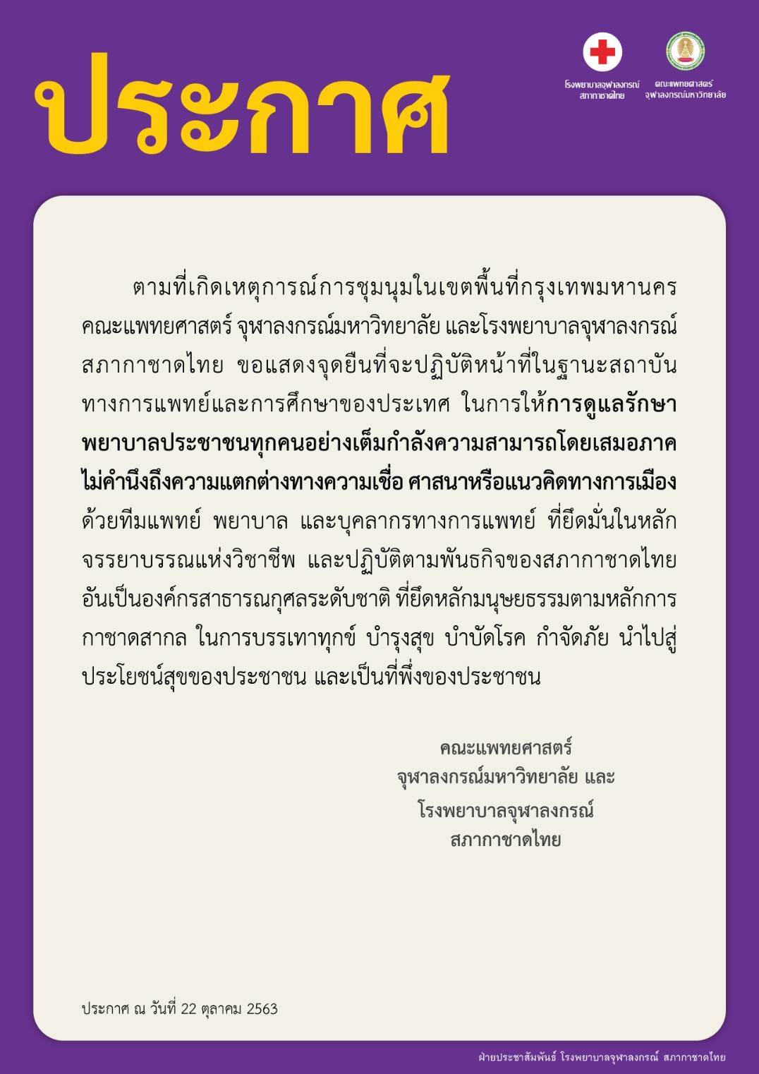 คณะแพทยศาสตร์ จุฬาลงกรณ์มหาวิทยาลัย และโรงพยาบาลจุฬาลงกรณ์ สภากาชาดไทย ออกประกาศ ณ วันที่ 22 ตุลาคม 2563 ว่า ตามที่เกิดเหตุการณ์การชุมนุมในเขตพื้นที่กรุงเทพมหานคร คณะแพทยศาสตร์ จุฬาลงกรณ์มหาวิทยาลัย และโรงพยาบาลจุฬาลงกรณ์ สภากาชาดไทย ขอแสดงจุดยืนที่จะปฏิบัติหน้าที่ในฐานะสถาบันทางการแพทย์และการศึกษาของประเทศ ในการให้การดูแลรักษาพยาบาลประชาชนทุกคนอย่างเต็มกำลังความสามารถโดยเสมอภาค ไม่คำนึงถึงความแตกต่างทางความเชื่อ ศาสนา หรือแนวคิดทางการเมือง ด้วยทีมแพทย์ พยาบาล และบุคลากรทางการแพทย์ ที่ยึดมั่นในหลักจรรยาบรรณแห่งวิชาชีพ และปฏิบัติตามพันธกิจของสภากาชาดไทย อันเป็นองค์กร สาธารณกุศลระดับชาติ ที่ยึดหลักมนุษยธรรมตามหลักการกาชาดสากล ในการบรรเทาทุกข์ บำรุงสุข บำบัดโรค กำจัดภัย นำไปสู่ประโยชน์สุข ของประชาชนและเป็นที่พึ่งของประชาชน .-สำนักข่าวไทย