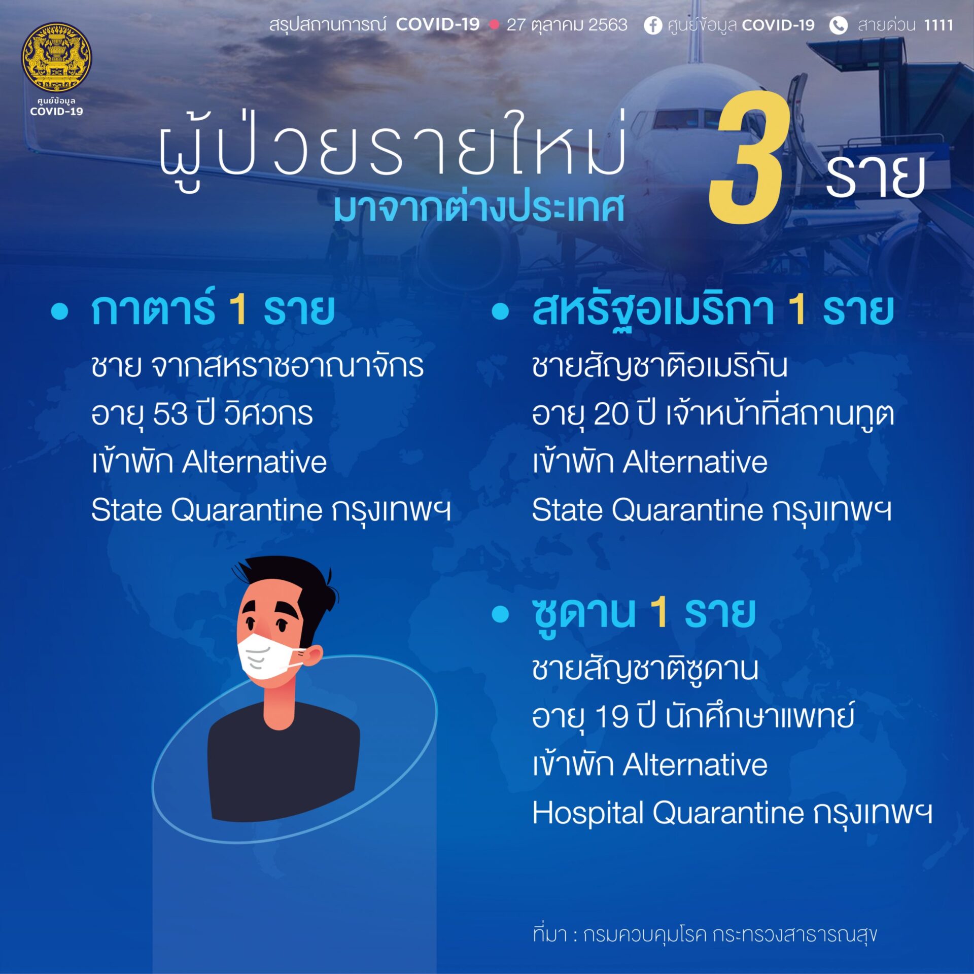 กทม.27 ต.ค.-ไทยพบผู้ติดเชื้อรายใหม่วันนี้ 3 รายเป็นชาวต่างประเทศทั้งหมด เข้าพักในสถานที่รัฐจัดให้ ขณะที่ทั่วโลกป่วยรวมกว่า 43 ล้านรายและเสียชีวิตกว่า 1.1 ล้านราย