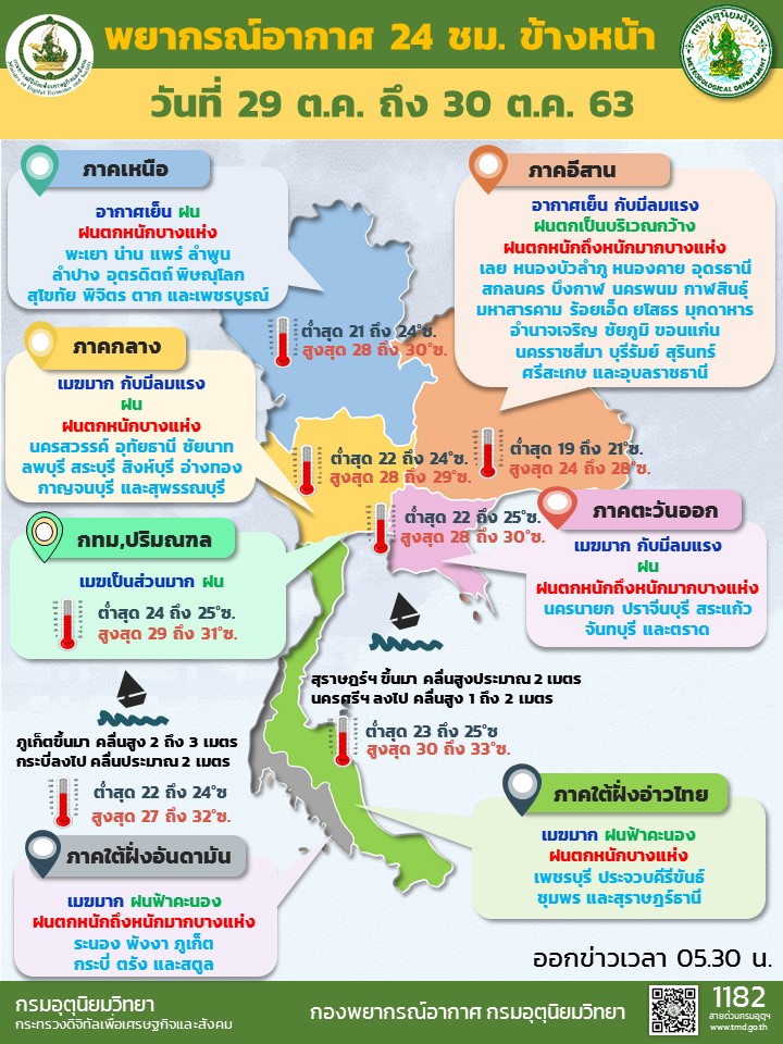 กรมอุตุนิยมวิทยา พยากรณ์อากาศ 24 ชั่วโมงข้างหน้า พายุโซนร้อน “โมลาเบ” (พายุระดับ 3) ได้อ่อนกำลังลงเป็นพายุดีเปรสชัน (พายุระดับ 2) บริเวณจังหวัดอุบลราชธานีแล้ว คาดว่าจะอ่อนกำลังลงเป็นหย่อมความกดอากาศต่ำกำลังแรง (พายุระดับ 1) ในระยะต่อไป ทำให้ประเทศไทยตอนบนมีฝนเป็นบริเวณกว้าง และมีฝนตกหนักถึงหนักมากบางแห่งกับมีลมแรง สำหรับลมตะวันตกเฉียงใต้ที่พัดปกคลุมทะเลอันดามัน ภาคใต้ และอ่าวไทยมีกำลังแรง ส่งผลทำให้ภาคใต้มีฝนตกหนักบางแห่งกับมีลมแรง ขอให้ประชาชนในพื้นที่เสี่ยงภัยในภาคเหนือ ภาคตะวันออกเฉียงเหนือ ภาคตะวันออก และภาคใต้ ระวังอันตรายจากฝนตกหนัก อาจทำให้เกิดน้ำท่วมฉับพลันและน้ำป่าไหลหลากได้