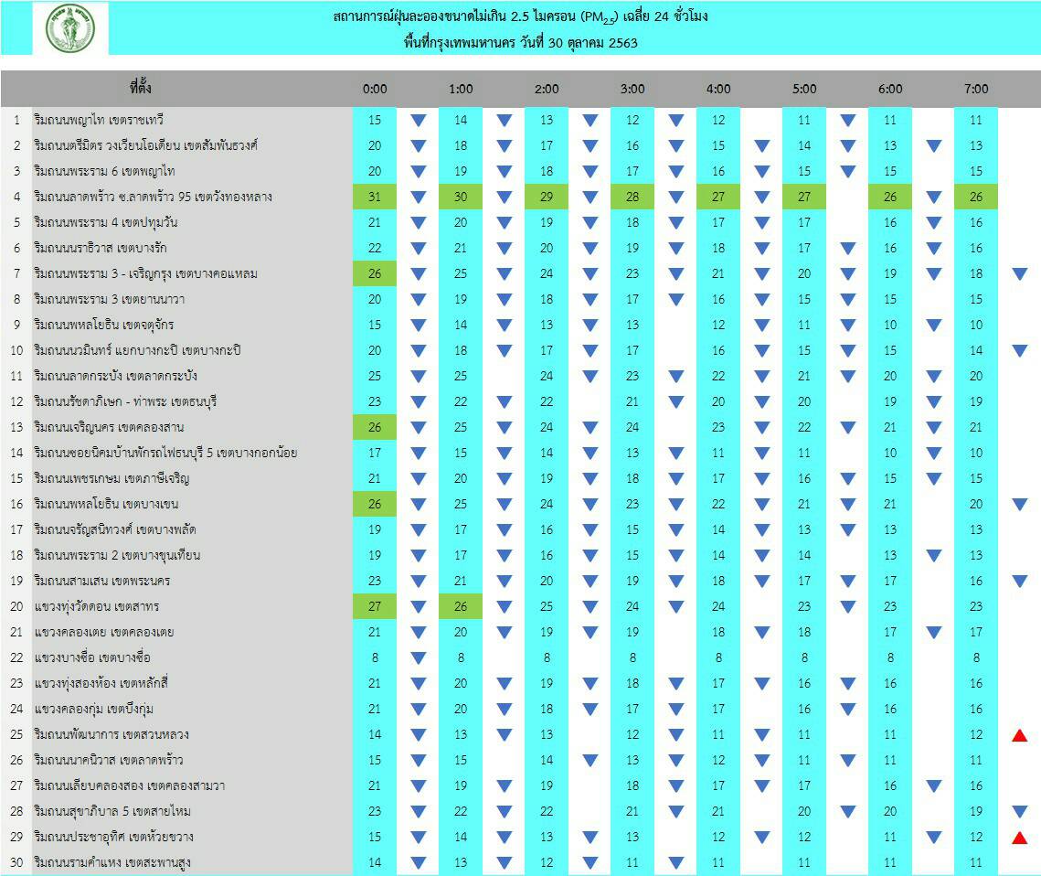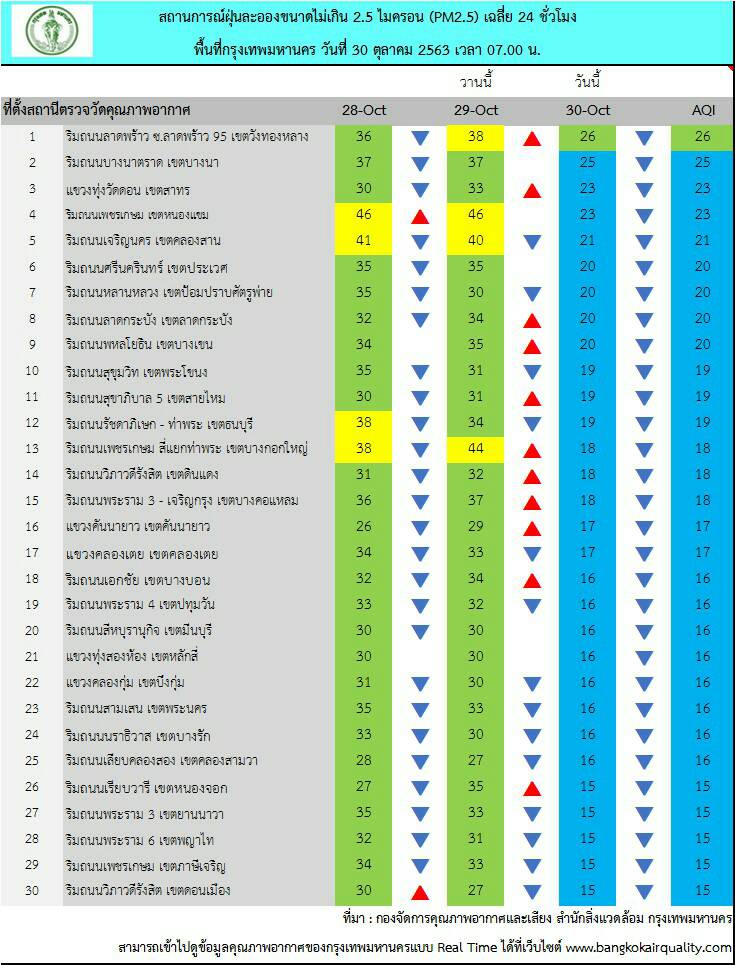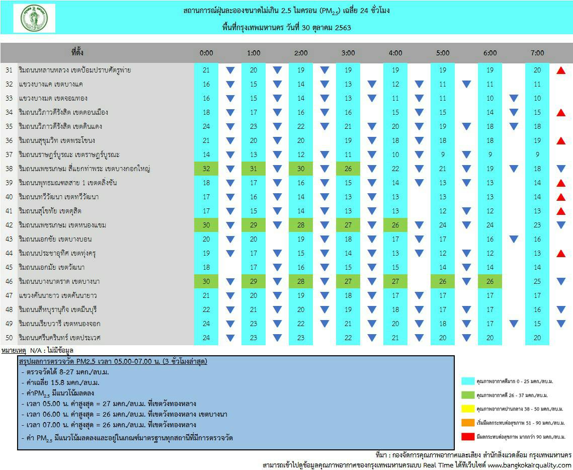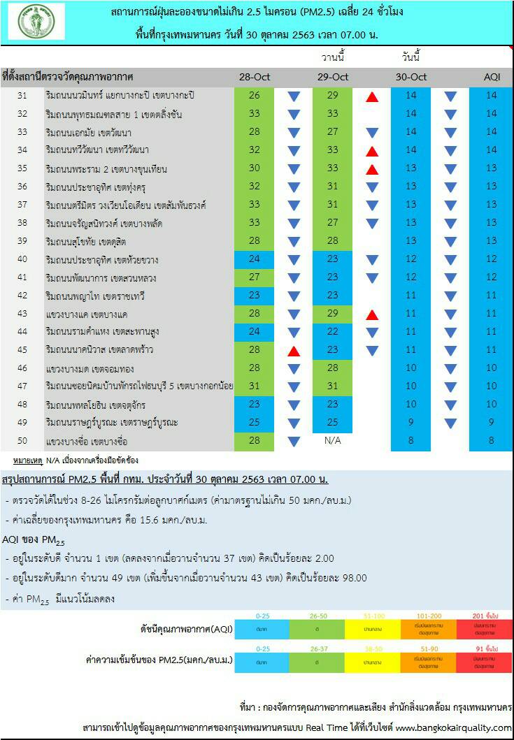 ศูนย์ประสานงานและแก้ไขปัญหามลพิษทางอากาศในกรุงเทพมหานครรายงานสถานการณ์ฝุ่นละอองขนาดไม่เกิน 2.5 ไมครอน (pm2.5) ของสถานีตรวจวัดคุณภาพอากาศของกรุงเทพมหานคร ประจำวันศุกร์ที่ 30 ตุลาคม พ.ศ.2563 เวลา 07.00 น.ค่าเฉลี่ย 24 ชั่วโมงของฝุ่นละอองขนาดไม่เกิน 2.5 ไมครอน(PM2.5) ตรวจวัดได้ 8-26 ไมโครกรัม/ลูกบาศก์เมตร (มคก./ลบ.ม.) พบว่าไม่เกินมาตรฐานทุกพื้นที่ที่มีการตรวจวัด (มาตรฐานไม่เกิน 50 มคก./ลบ.ม.)