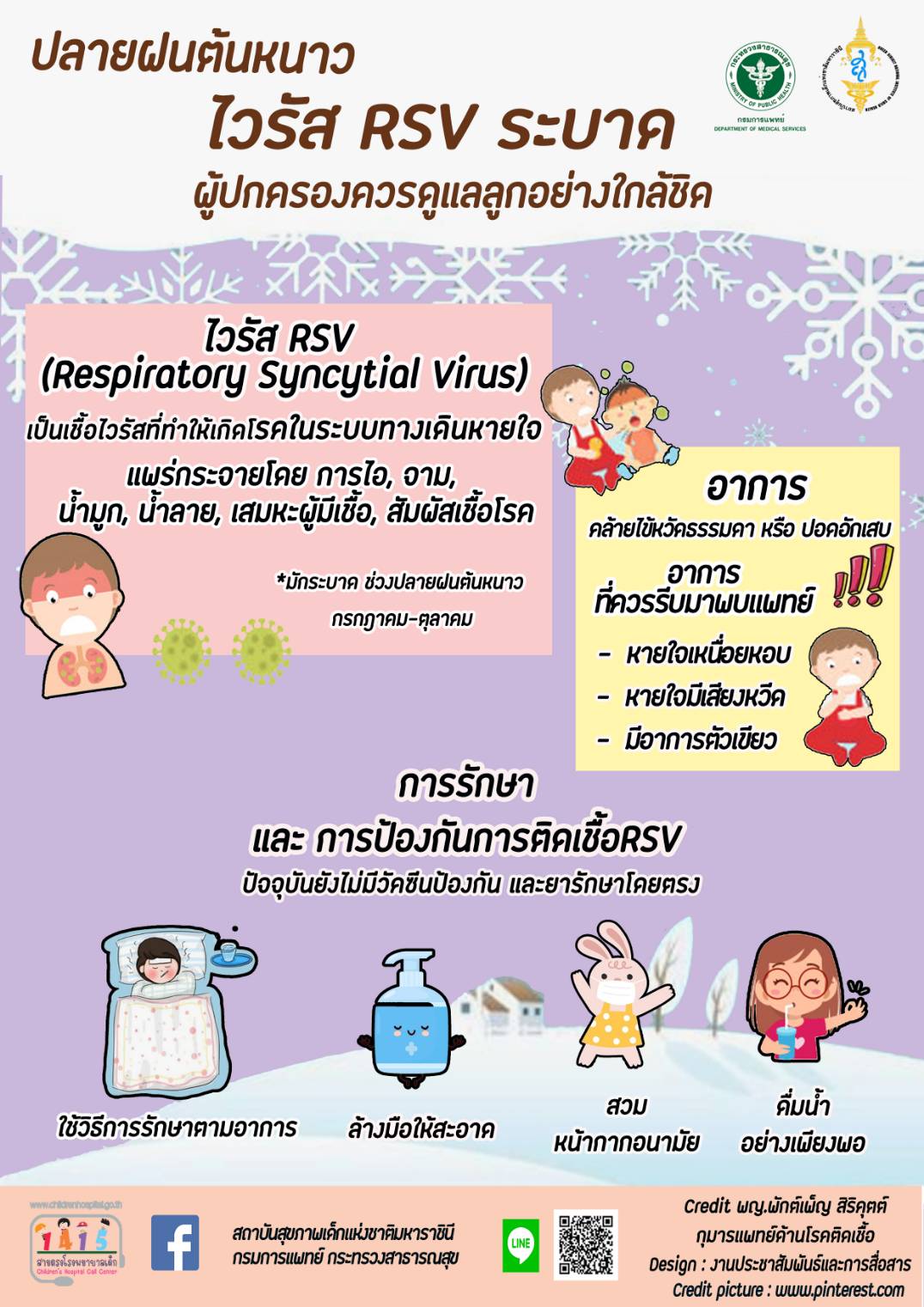 นพ.สมศักดิ์ อรรฆศิลป์ อธิบดีกรมการแพทย์ เปิดเผยว่า เชื้อไวรัส RSV มักระบาดมากในช่วงปลายฤดูฝนต้นฤดูหนาวหรือประมาณเดือนกรกฎาคม – ตุลาคม เด็กที่ป่วยจะมีอาการเบื้องต้นคล้ายเป็นไข้หวัดธรรมดา มีน้ำมูก ไข้ ไอ จาม พ่อแม่จึงต้องคอยสังเกตอาการของลูกอย่างใกล้ชิด หากมีอาการคล้ายปอดอักเสบร่วมด้วยควรรีบพาเด็กไปพบแพทย์เพื่อรับการรักษาต่อไป