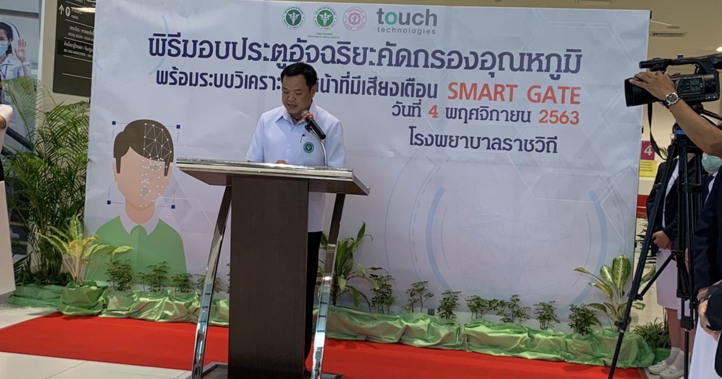 นพ.สมศักดิ์ อรรฆศิลป์ อธิบดีกรมการแพทย์ กล่าวว่า โรงพยาบาลราชวิถีถือเป็นหนึ่งในโรงพยาบาลหลักของกระทรวงสาธารณสุข ในการรักษาผู้ป่วยโรคโควิด-19 และให้บริการรักษาโรคอื่นๆ สถิติมีผู้ป้วยมาใช้บริการแผนก ผู้ป่วยนอกเฉลี่ย 6,000คน/วัน จากเดิมการวัดอุณหภูมิร่างกายคนไข้เป็นการวัดแบบเครื่องดิจิตอลโดยใช้บุคลากรทางการแพทย์วัดราย บุคคล ซึ่งถือเป็นความเสี่ยงต่อการติดเชื้อและภาระงานที่เพิ่มชื้น การสนับสนุนเครื่องวัดอุณหภูมิอัจฉริยะของบริษัท ทัช เทคโนโลยี จำกัด จะช่วยช่วยลดการ แพร่กระจายของเชื้อโรคและป้องกัน บุคลากรทางการแพทย์ให้ปลอดภัยจากเชื้อโรคได้ ช่วยลดภาระการทำงานและจำนวนเจ้าหน้าที่คัดกรองและลดการสัมผัส สร้างความปลอดภัย ทั้งเจ้าหน้าที่ปฏิบัติงาน และญาติ