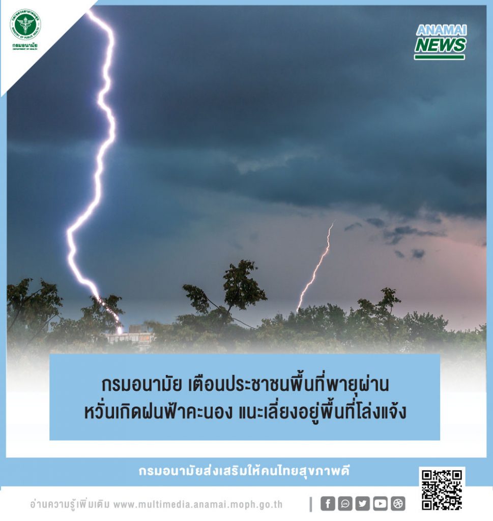 กรมอนามัย 5 พ.ย.- สธ.แนะประชาชนที่อยู่ในพื้นที่ที่คาดว่าจะประสบกับพายุผ่าน หวั่นเกิดฝนฟ้าคะนอง แนะนำให้หลีกเลี่ยงอยู่ในบริเวณพื้นที่โล่งแจ้ง และงดใช้อุปกรณ์อิเล็กทรอนิกส์ที่เป็นสื่อเหนี่ยวนำไฟฟ้า ในช่วงฝนตกหนักเสี่ยงฟ้าผ่าได้ เพื่อความปลอดภัย