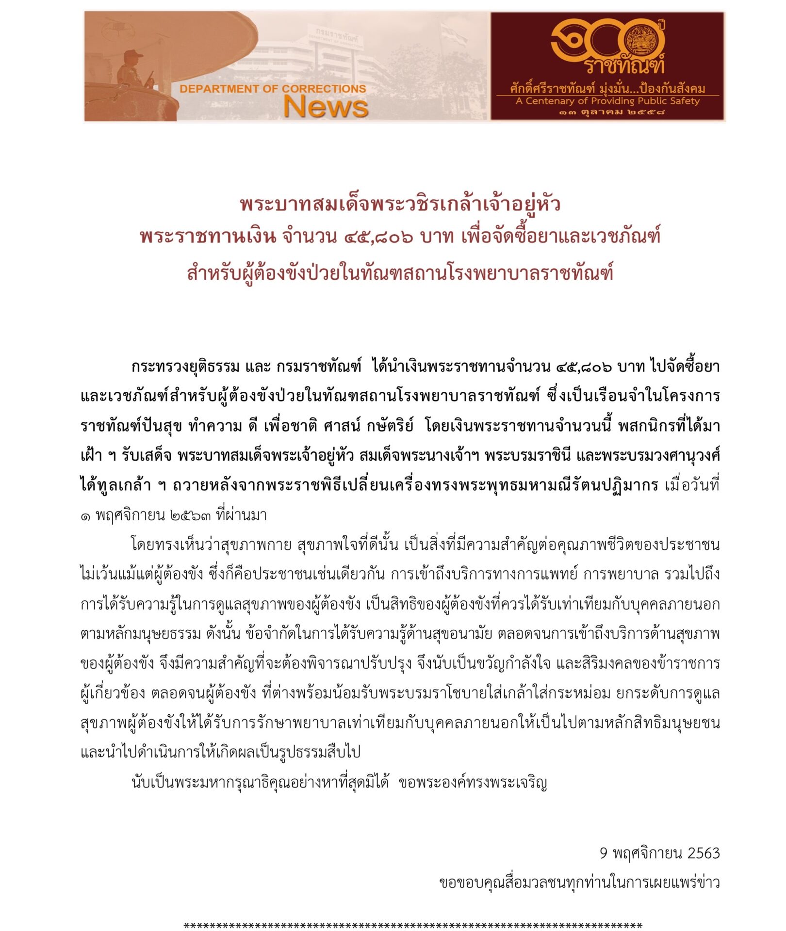 กรมราชทัณฑ์ 9 พ.ย.-พระบาทสมเด็จพระเจ้าอยู่หัว พระราชทานเงินจำนวน 45,806 บาท จากพสกนิกรที่มาเฝ้าฯ รับเสด็จ เมื่อ 1 พ.ย.63 ให้แก่กรมราชทัณฑ์ ซึ่งได้นำไปจัดซื้อยาและเวชภัณฑ์สำหรับผู้ต้องขังป่วย ในทัณฑสถานโรงพยาบาลราชทัณฑ์