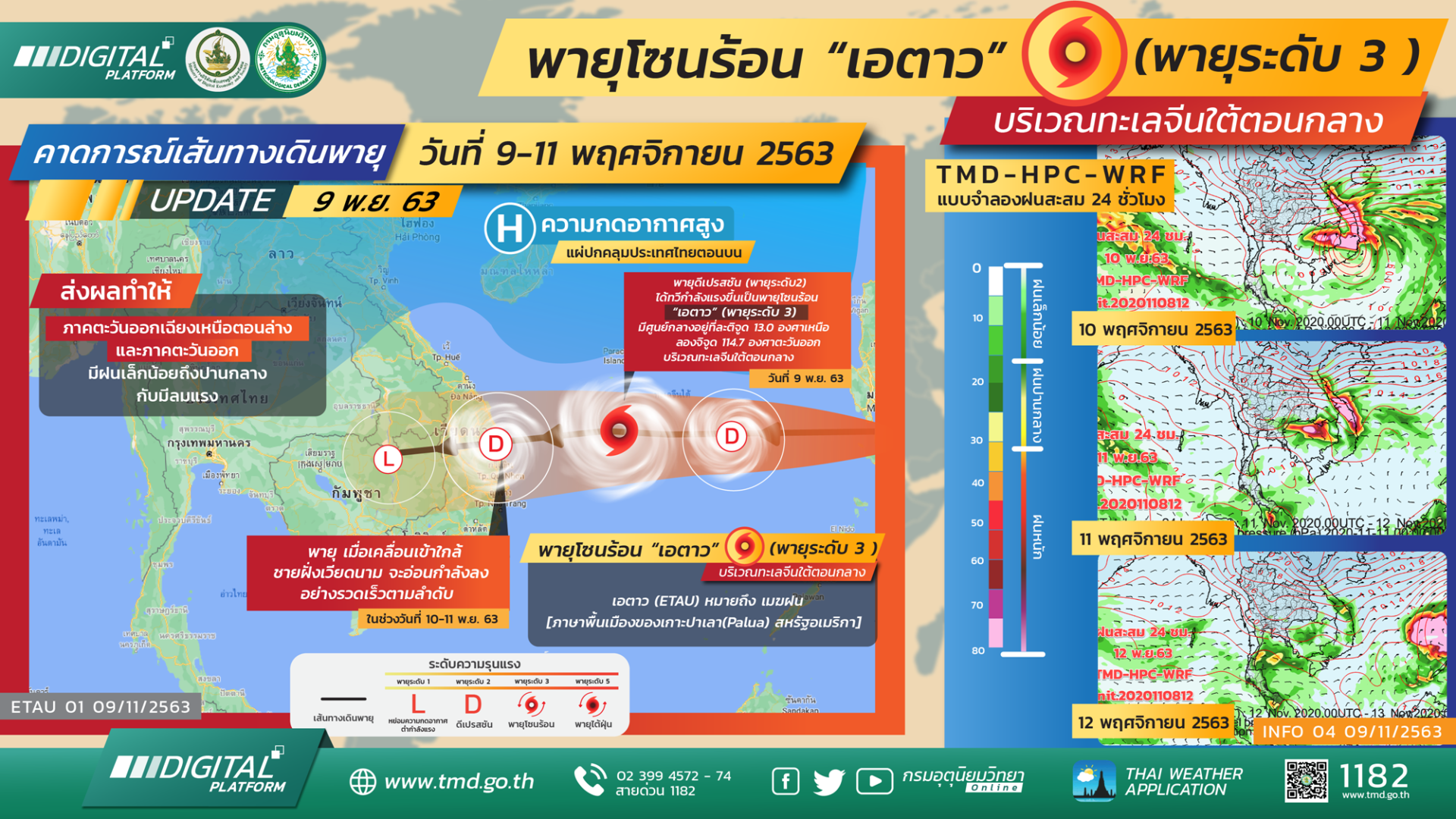 น.ส.กรรวี สิทธิชีวภาค รองอธิบดีกรมอุตุนิยมวิทยา รักษาราชการแทนอธิบดีกรมอุตุนิยมวิทยา กล่าวถึงสถานการณ์พายุโซนร้อน “เอตาว” บริเวณทะเลจีนใต้ตอนกลาง คาดว่าจะเคลื่อนขึ้นฝั่งประเทศเวียดนามตอนกลางวันพรุ่งนี้ (10 พ.ย.) และจะอ่อนกำลังลงเป็นพายุดีเปรสชัน หย่อมความกดอากาศต่ำกำลังแรงแถวประเทศกัมพูชา แม้ตัวพายุจะสลายก่อนเข้าไทย แต่ด้วยอิทธิพลของตัวพายุทำให้ประเทศไทยได้รับผลกระทบอยู่บ้าง ส่งผลให้ประเทศไทยตอนบน โดยเฉพาะแถบอีสานตอนล่าง และทางภาคตะวันออก มีฝนเล็กน้อยถึงปานกลาง แต่จะมีลมแรง ช่วงวันที่ 10-12 พ.ย.นี้