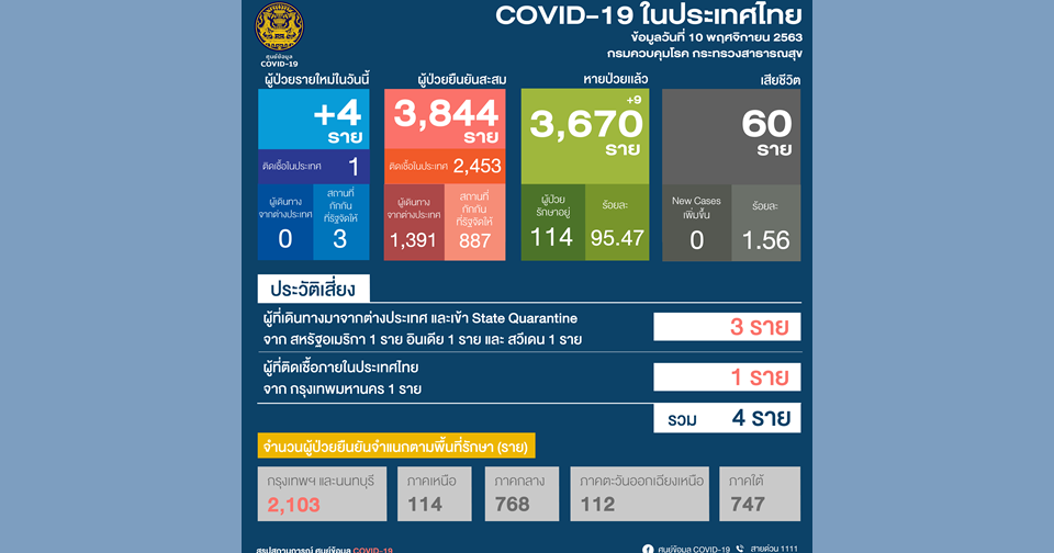 ศูนย์ข้อมูลCOVID-19 รายงานสถานการณ์การติดเชื้อโควิด-19 ประจำวันอังคารที่ 10 พฤศจิกายน 2563 ว่า มีผู้ป่วยรายใหม่ 4 ราย ผู้ป่วยยืนยันสะสม 3,844 ราย หายป่วยแล้ว 3,670 ราย เสียชีวิตสะสม 60 ราย